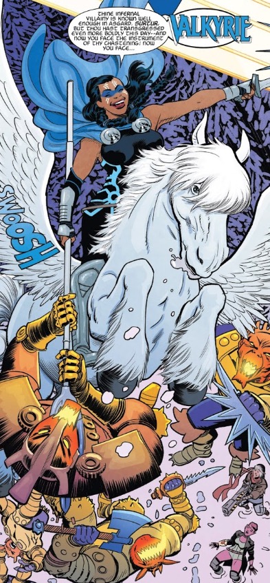 We rejoin the action with the Tallus transporting the trio out of danger and into another alternate universe, where it's time to recruit their next team member. Ms. Marvel is understandably upset that the Time-Eater ate her universe, but Iron Lad says he can pick up remnants of energy from his own destroyed universe on his Iron Lad sensors, so maybe there's hope. As Iron Lad agrees to join the team, they're interrupted by a battler between Norse demon Surtur and his forces against a Valkyrie designed to resemble Tessa Thompson's version from the Marvel Cinematic Universe. X-pository dialog from Surtur reveals that Valkyrie is the "lone defender of Asgard" in this dimension.