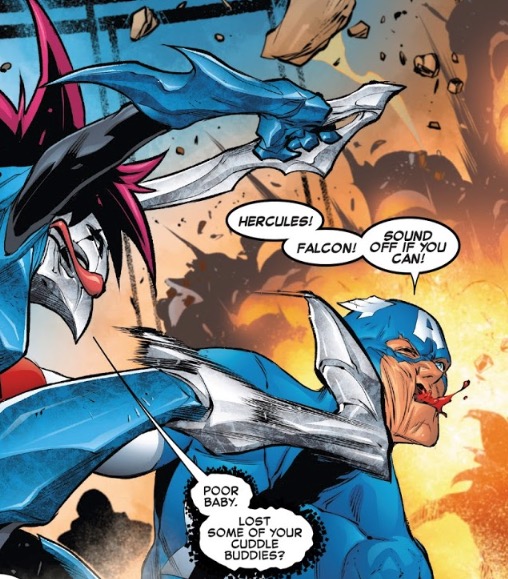 On the bridge, Cap is getting his butt kicked by Poison Killer Thrill (though she's not named here).