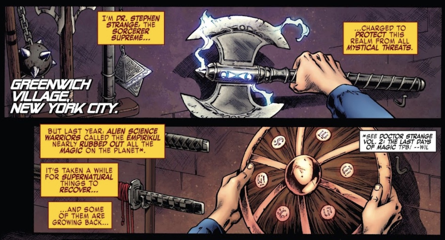 That catches you up with the previous issue, but this one starts out not in Alaska, but in Greenwich Village in the Sanctum Santorum of Doctor Strange, the Sorcerer Supreme. This book is really trying for X-tra brownie points here in X-ual Healing, because Strange utilizes X-pository caption boxes right off the bat to introduce himself, explain who he is, and recap his recent history while editor Wil Moss tells you where to go read about it if you want to know more. Nicely done.