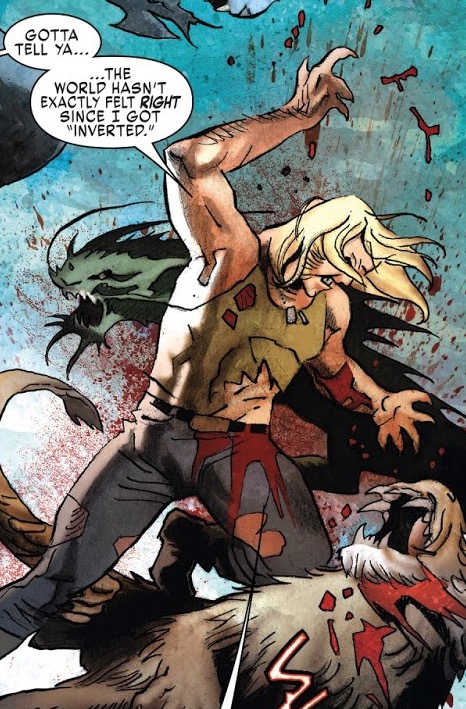 …referencing the AXIS (or SIXIS if you read the poorly designed logo wrong) super-mega-crossover event, in which the heroes and the villains were "inverted," making the good guys good and the bad guys bad. At the end of the event, Sabretooth's inversion was permanent. You could learn that by reading about it on Marvel Unlimited… but this comic doesn't tell you that. Missed opportunity.