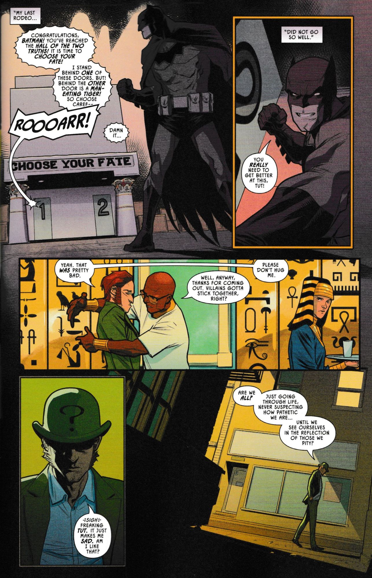 The comic book sees Riddler teaming up with King Tut to take down Batman using all the traditional means. Traps. Choices. Riddles. And going through a mid-life crisis. The greatest riddle of all – why the hell does he do this? Or rather, do it like this?