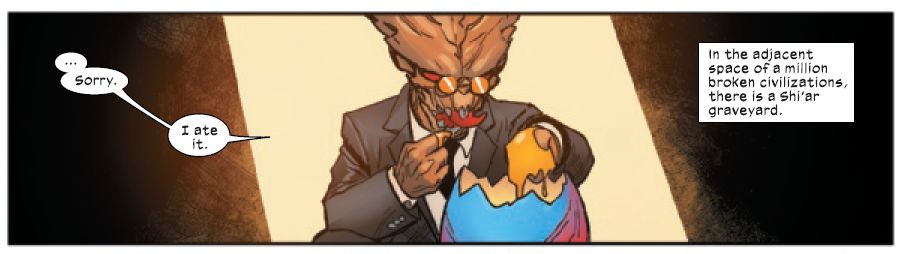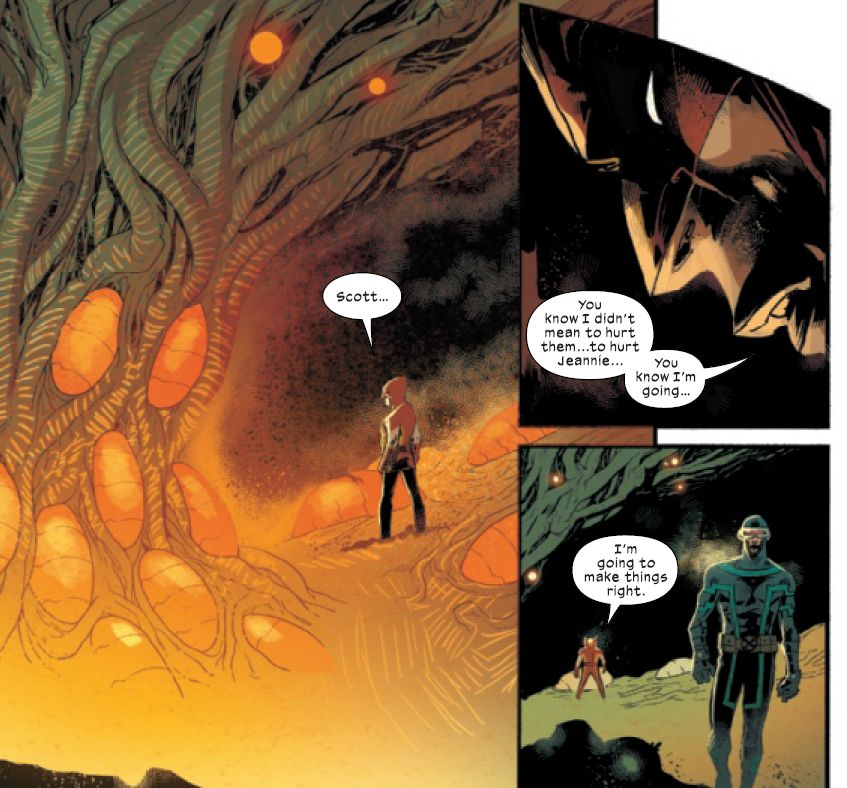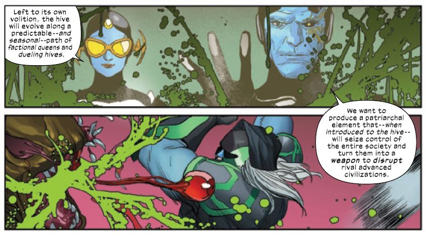 Thankfully everyone gets better now. But man, I wonder if those adjourning doors in the Summer House are going to be locked now? While over in X-Men #9 goes back to Shiar/Kree/Brood space… and back in time to see the origin of the Brood, and how they are repurposed to be a Kree biological weapon-in-waiting.