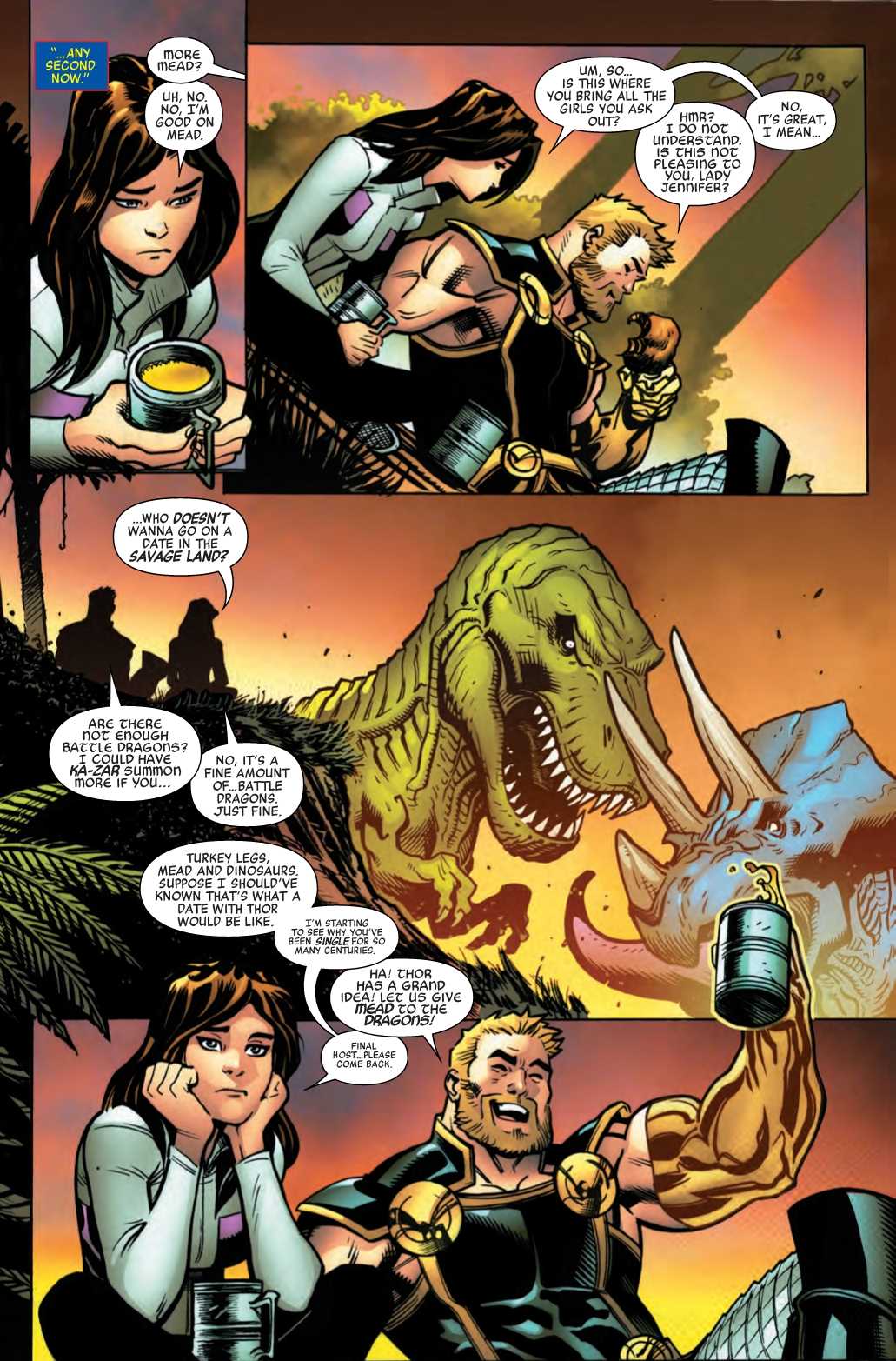 But despite their incredible chemistry when She-Hulk is all hulked out, when she's just regular, non-Hulky Jennifer Walters, Thor's charm is a little bit less appealing. First of all, he takes her to the Savage Land on their date, where he's arranged for Ka-zar to stage a dinosaur fight. And you won't believe what else he wants to do with those dinosaurs…