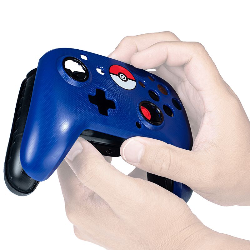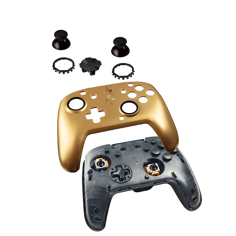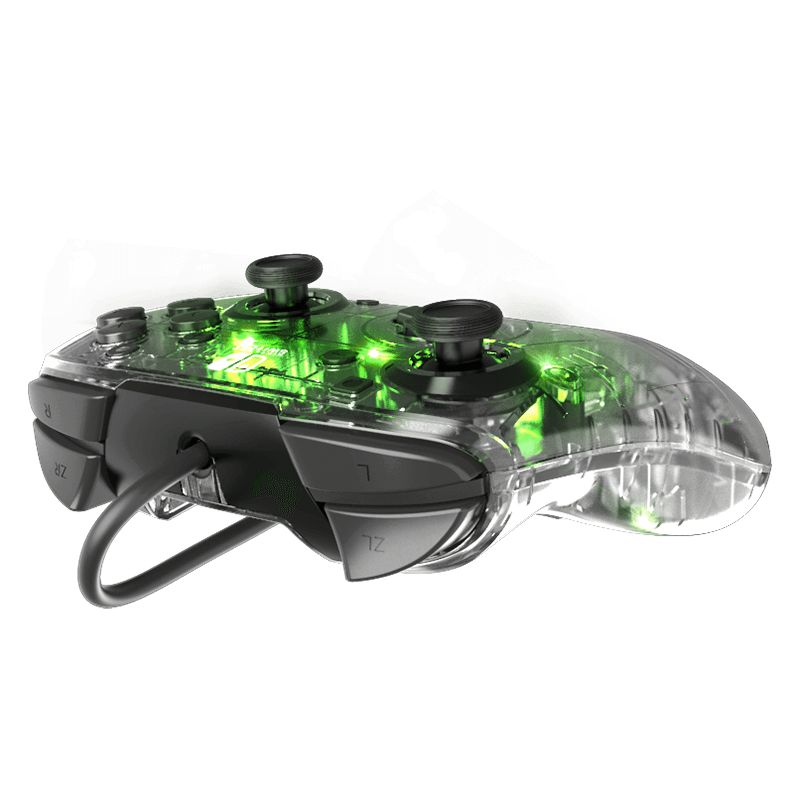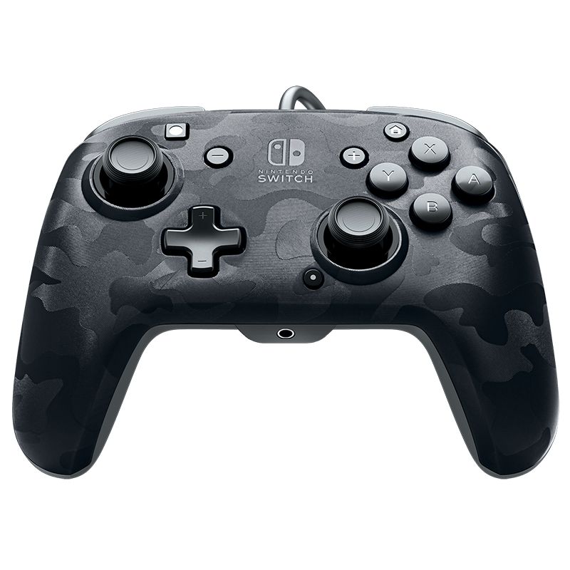 We'll start with the items they've sent for the Nintendo Switch, as they are a licensed third-party maker of their external gear. One of the hot items they had in 2019 was the Faceoff Deluxe+ Wired Controller. They released these in a few different colors such as red, blue, and black. This is basically an enhanced version of a Pro Controller with all the stuff you wish the Pro Controller came with. The front face is a camouflage pattern, with a smooth set of buttons and thumbsticks that have an indent for more comfortable gaming. It comes with a 3.5mm jack on the bottom so you can use a headset to listen to the game. Plus a pair of dual programmable buttons on the back.