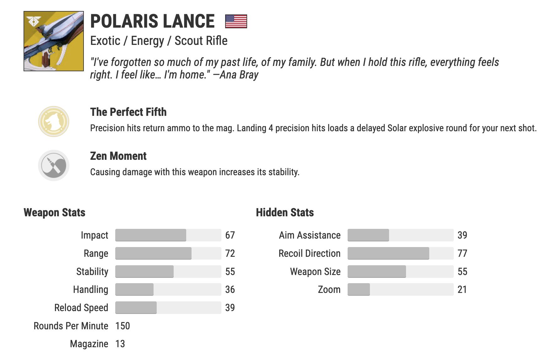 So: A direct comparison to Polaris Lance shows a couple things: They're slightly different scout rifle archetypes. Polaris a 150 round per minute scout rifle, by design, fires slower and hits a little harder than Oxygen SR3, a 180 round per minute scout. But it doesn't do that much more. I use a bunch of math past here, mostly taken from light.gg (Below screencaps are from light.gg) and Braytech which have added hard numbers to Bungie's published stats pages for the Polaris Lance and Oxygen SR3.