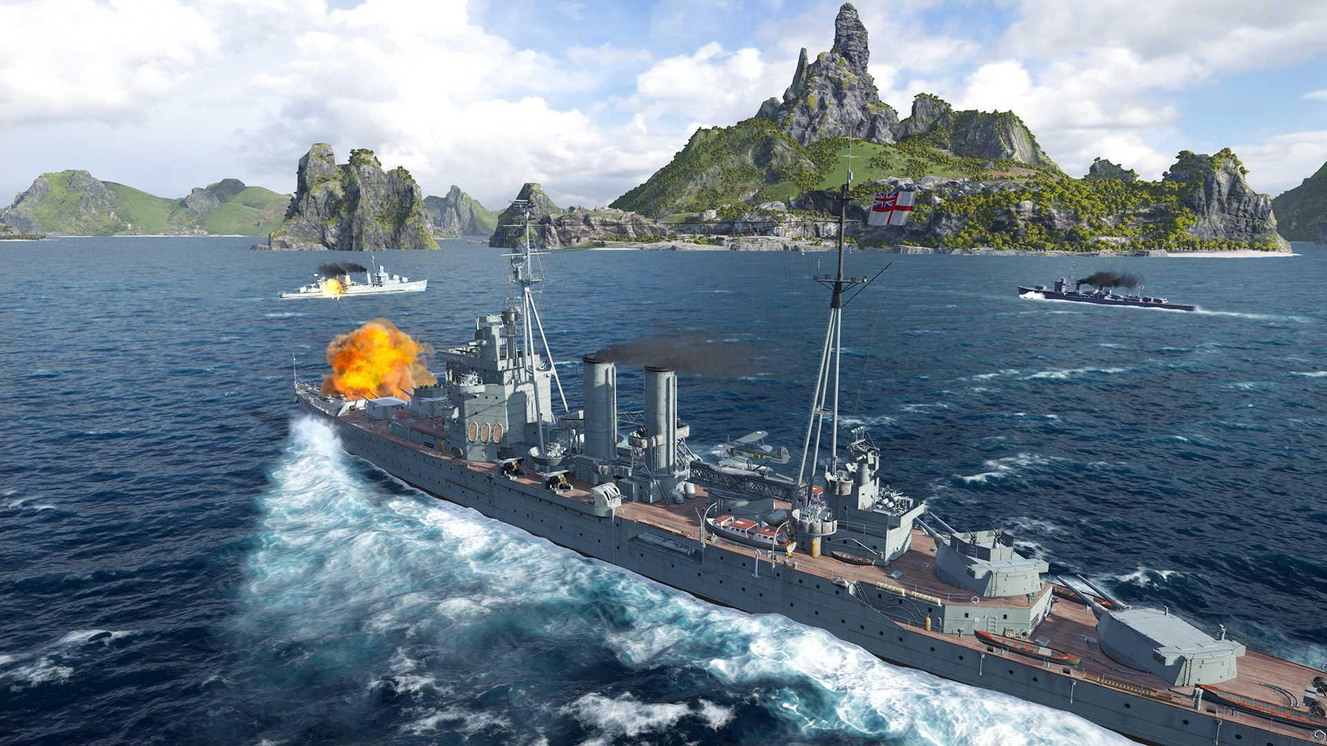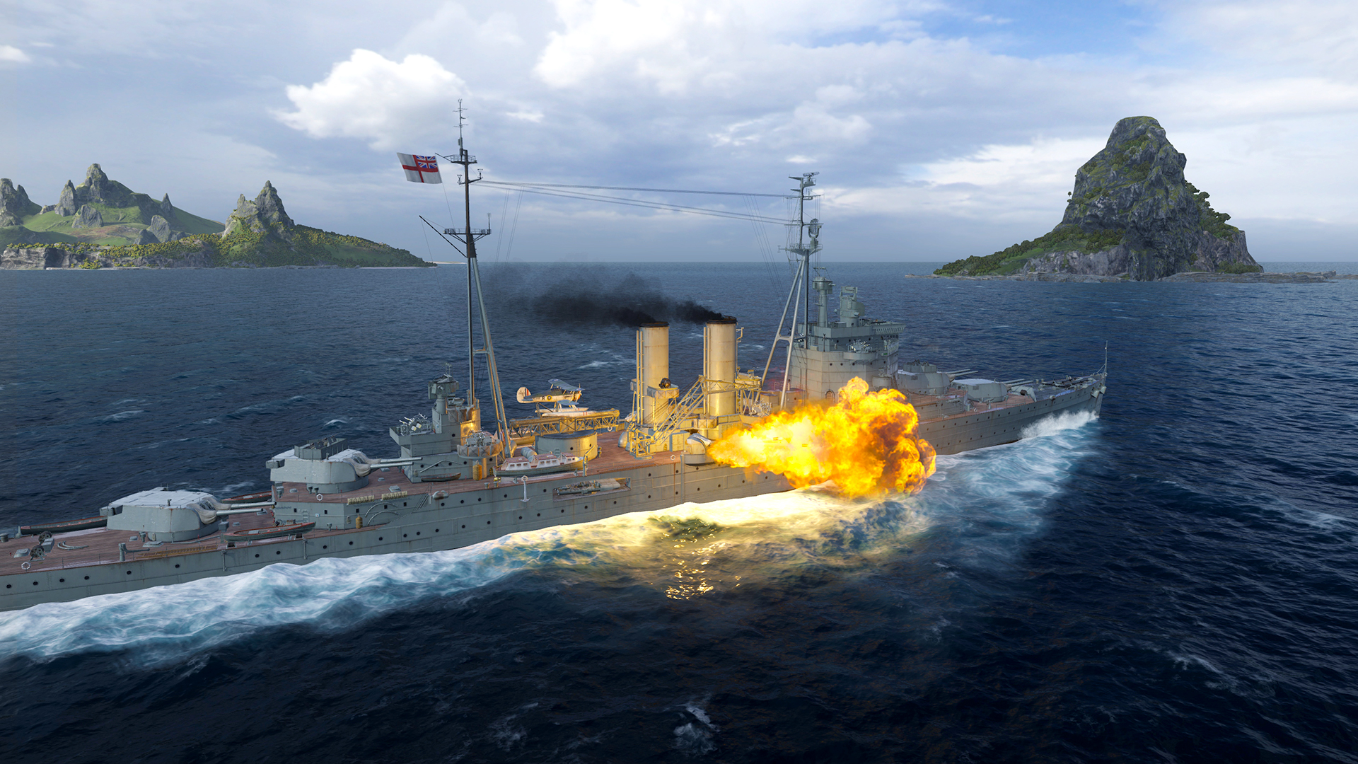 There are some newcomers to the British tech tree in this update as well, a series of heavy cruisers. Starting at Tier IV, these ships carry powerful, low-velocity guns and are relatively well protected. Plus, they are well equipped with torpedoes, Sonar and a Repair consumable. It will take clever positioning to get the most from these ships, but they are sure to shake things up! Players can take command of these ships in early access by opening British Cruiser Containers, plus get the new Union Jack camouflage for their ships.