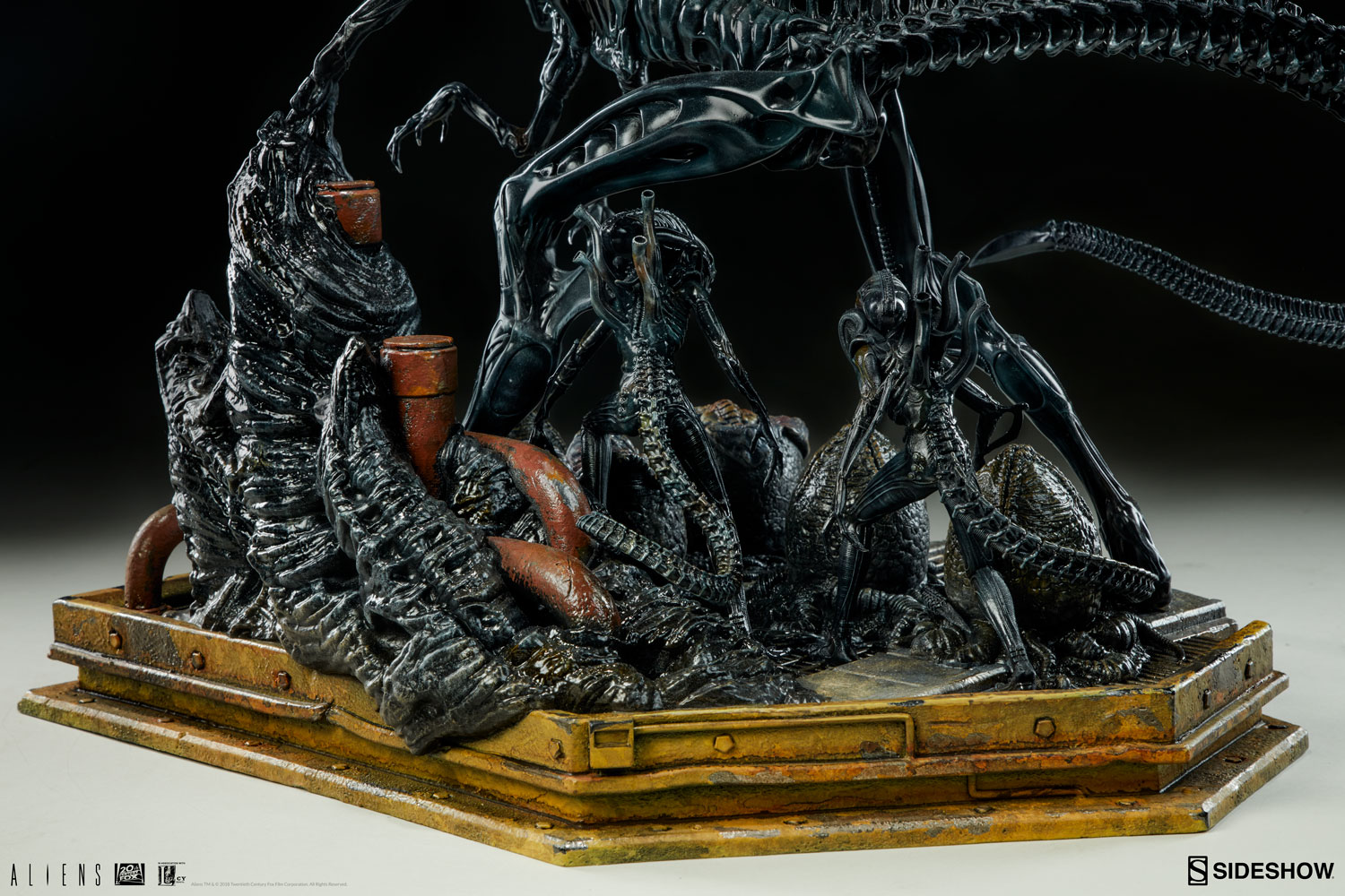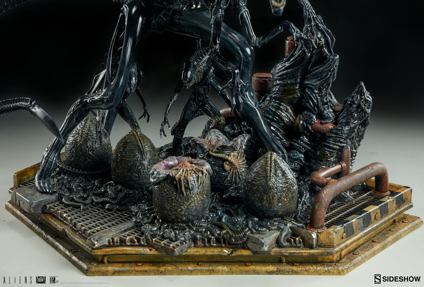 The Alien Queen Maquette stands 19" tall, with the monstrous matriarch prowling atop an intricate egg chamber base. The nightmarish Xenomorph brood beneath her feet features an elaborate array of Alien Eggs, Facehuggers, and two Alien Warriors all in standing scale with their Queen.