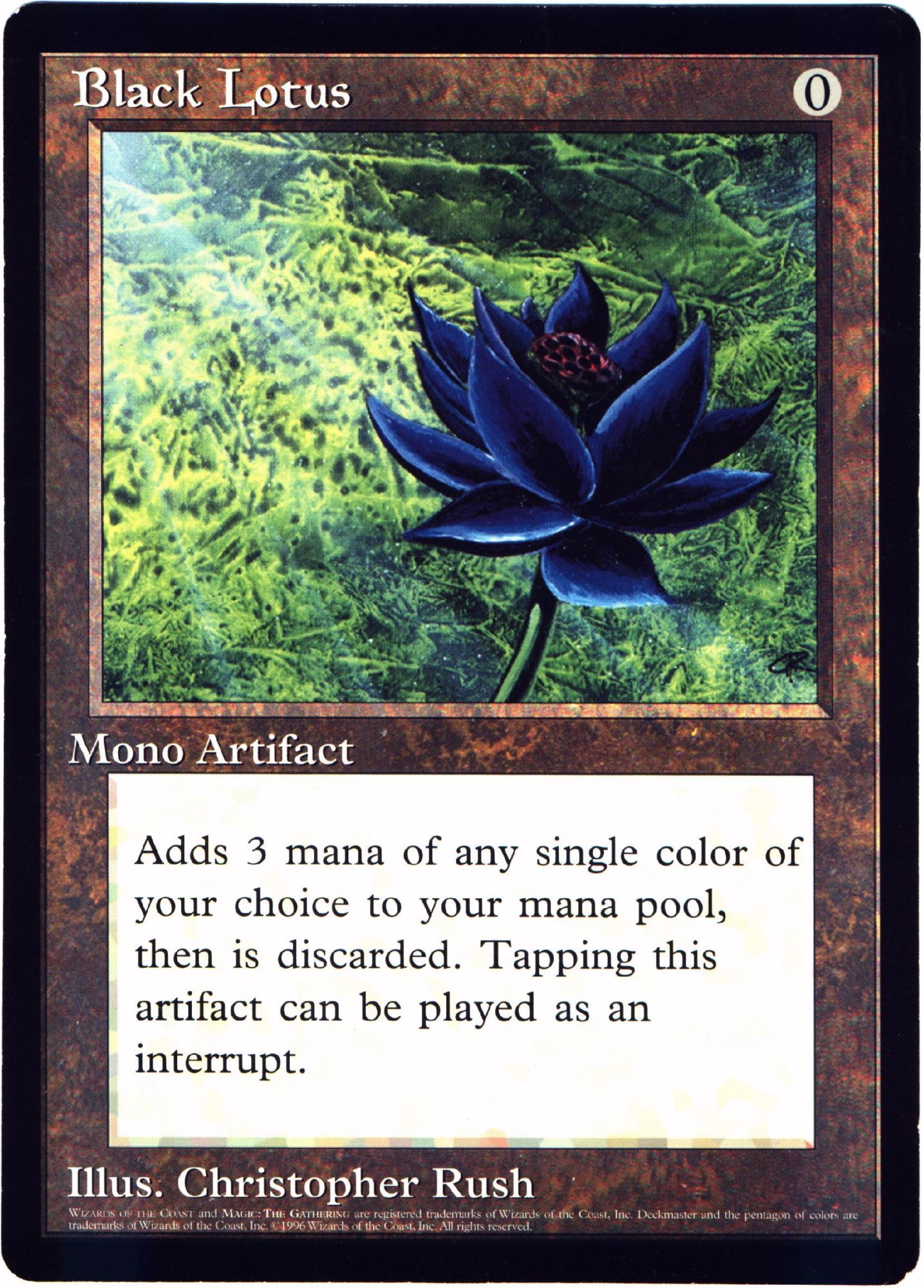 When the game first came out, Alpha and Beta were basically all there was to Magic: The Gathering, with some cards being much rarer than others. The artifact known as Black Lotus happens to be one of those original rare cards, which by itself is pretty powerful as you get three mana instantly by tapping it. Some have called it overpowered, like Fork, Ancestral Recall, or Timetwister, but that's another topic altogether. Over the years the card has been re-released in few selective sets like the Collectors' Edition and Vintage Masters, but the original remains pretty valuable. You can identify it by the black border for being original, as re-releases have a white border, like the Unlimited version that can be sold for $8k online.