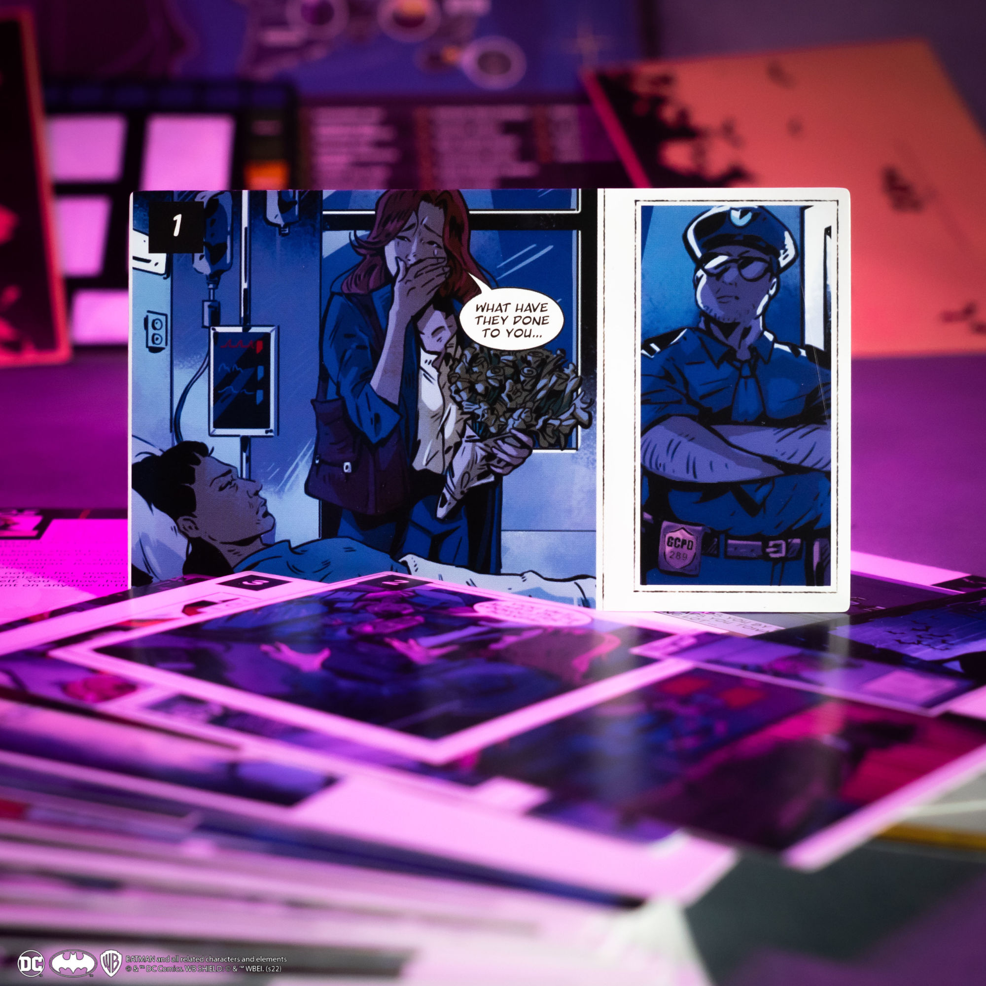 In Batman: Everybody Lies, players are challenged to solve a mystery with limited time and resources. They are presented with various clues and paths to begin their investigation, make their own decisions, and draw conclusions as they pursue different Leads. Players utilize a variety of game components to facilitate gameplay and push the narrative forward. Each Episode gives players access to up to 24 Lead cards that provide essential clues and plot points, along with a dedicated website, and additional resources included in the game box for authentic investigative immersion, which includes a Scene deck, Personal Goal deck, and the Gotham City Gazette archives. Each Episode concludes with a Final Report that is processed through the website. The players must give correct answers to questions concerning the investigation and then they are presented with an Epilogue that reveals the resolution of the Case.