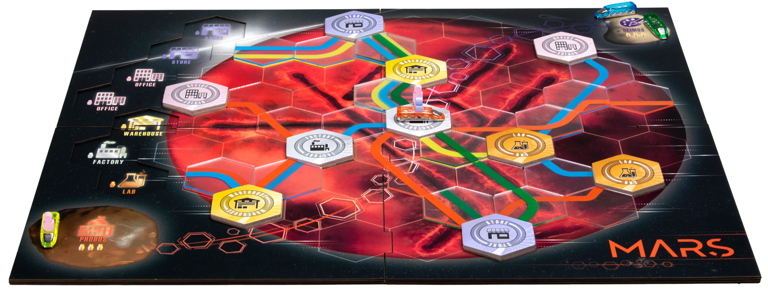 Mars: Maglev technology has enabled powerful ships arriving at Mars to build a colony there. The thin atmosphere and canals make building tracks a challenge, but the rewards for setting up a launch site to neighboring moons Phobos and Deimos make it all worthwhile!