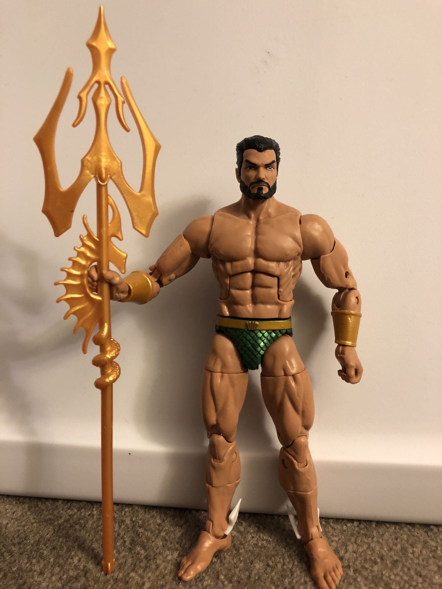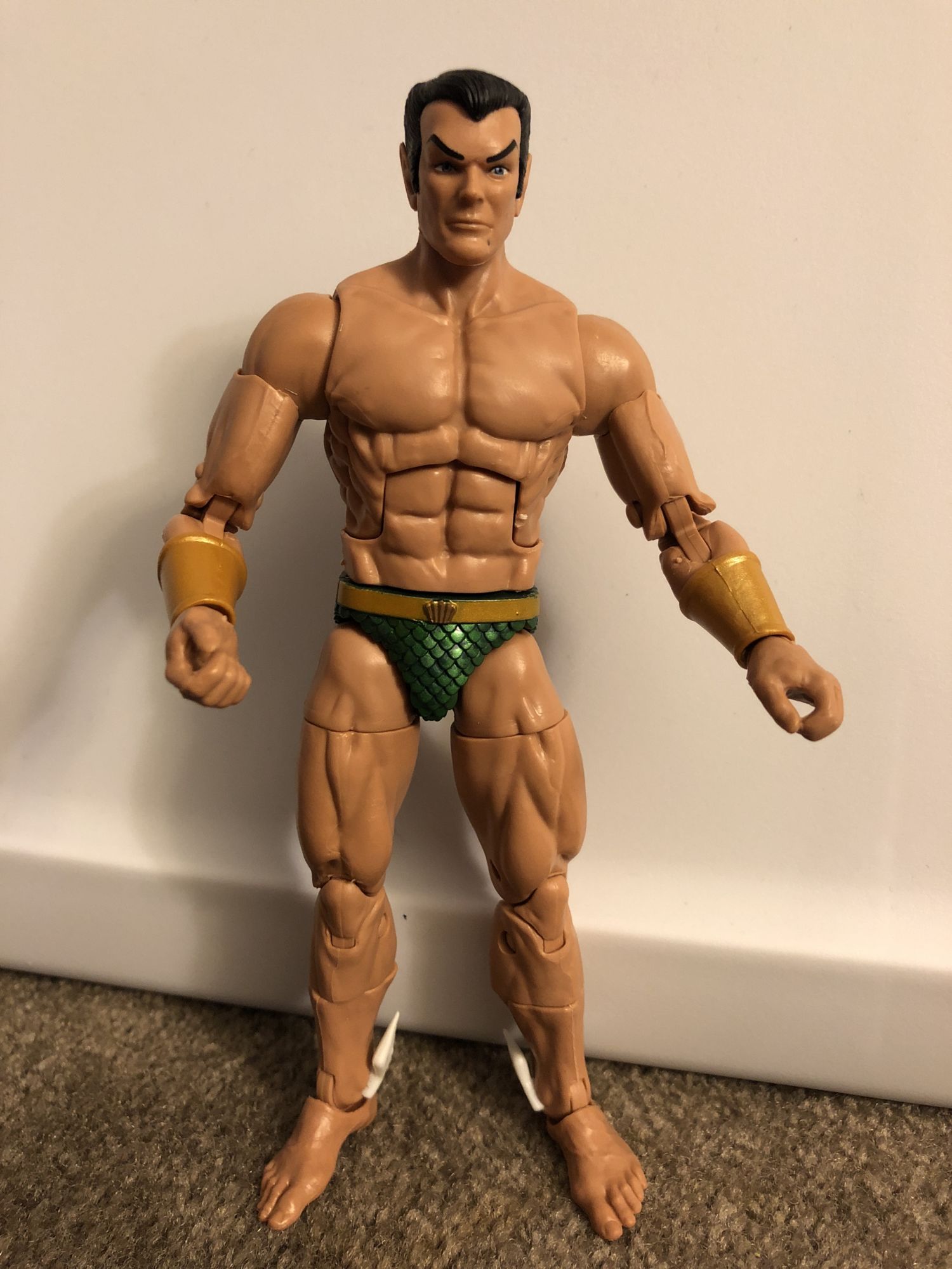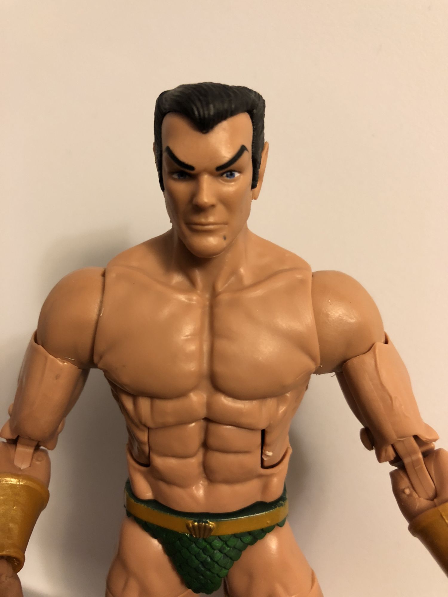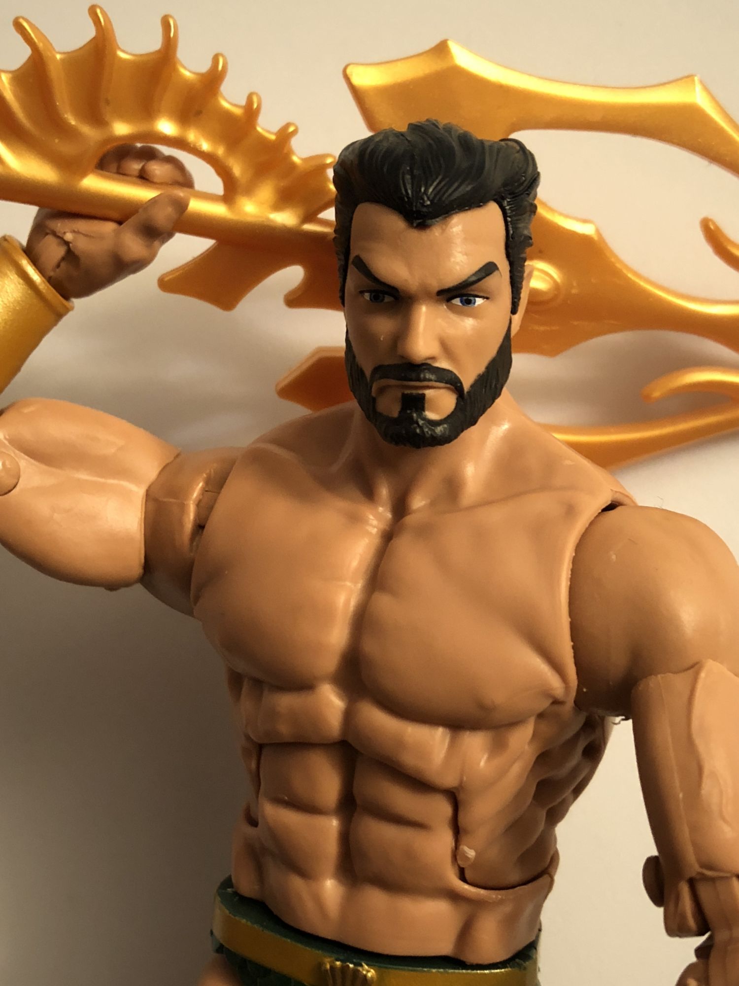 Next up is a classic Namor. I was really worried about the wings on his feet, I have read reports of them breaking off in the package. I was happy to see that was not the case here. For me, this figure is almost too muscular. The legs are like tree trunks on this guy! He comes with tons of interchangeable parts, including the alternate beard head, and swimming hands. And of course, his trident. I actually like the beard head way more, and my classic sculpt has a weird mark on his chin that sadly did not come off with a magic eraser. He is so veiny that it makes me uncomfortable, though!