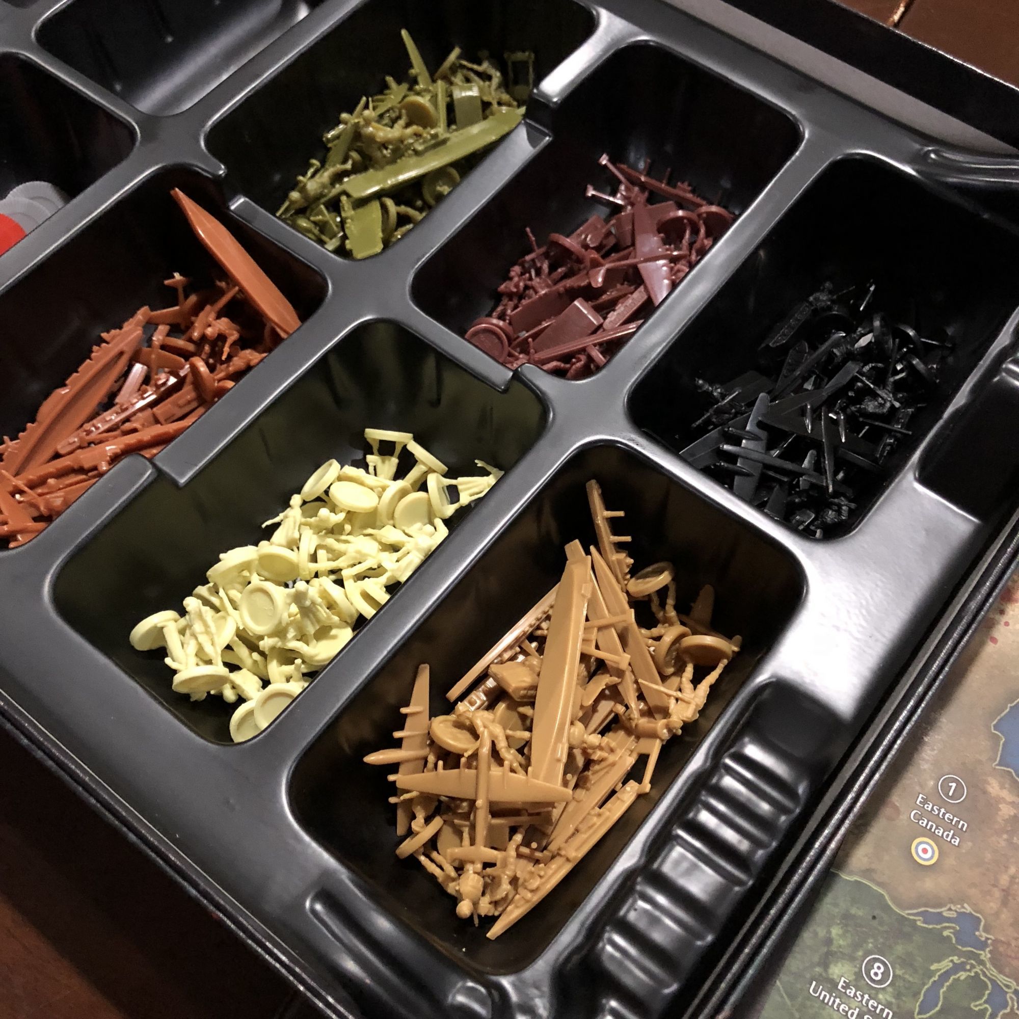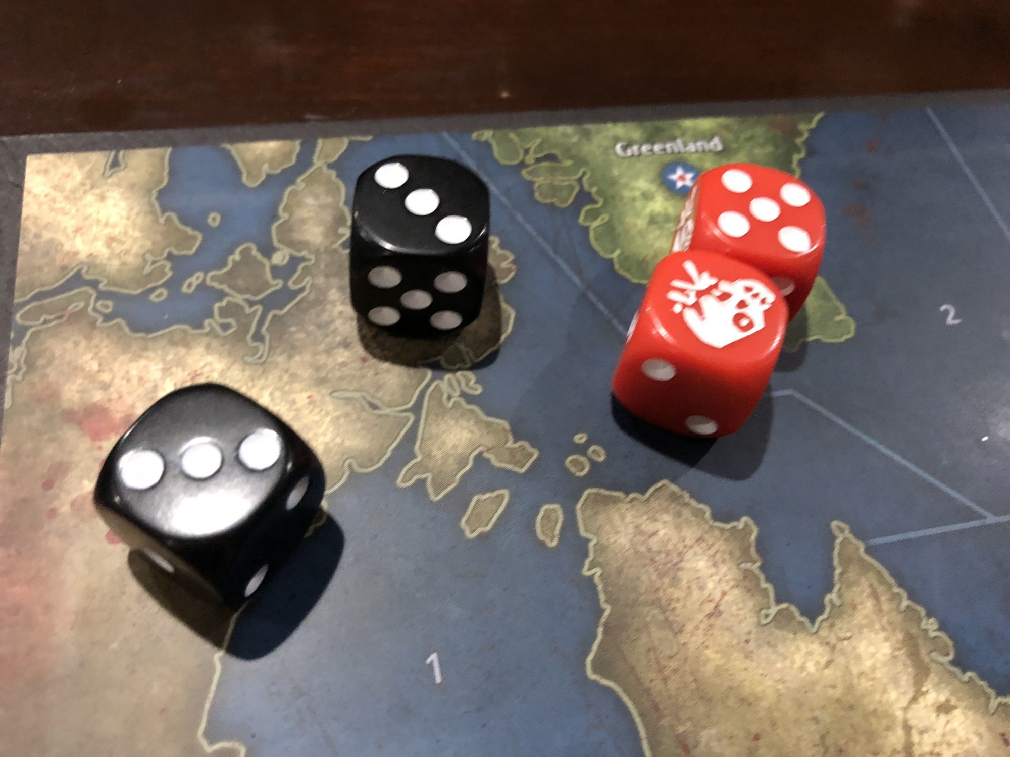 The game plays out like a fast-paced version of the original. You choose what territories you wish to conquer using a combination of infantry, tanks, cannons, aircraft, and ships, all of which have different rankings on the chart to show how much they're worth and how many dice you can roll to fight with each. The problem that comes up in the game is the zombies. The zombies are not treated like a regular enemy, more like an epidemic that's now hitting the world as you're fighting. Throughout the game, as you kill off each other, some of the people you kill turn into zombies and are placed on the countries that you just fought over. They are now a secondary enemy int he game that you have to wipe out of the area to truly control it, or else they can take you down and control the area themselves.