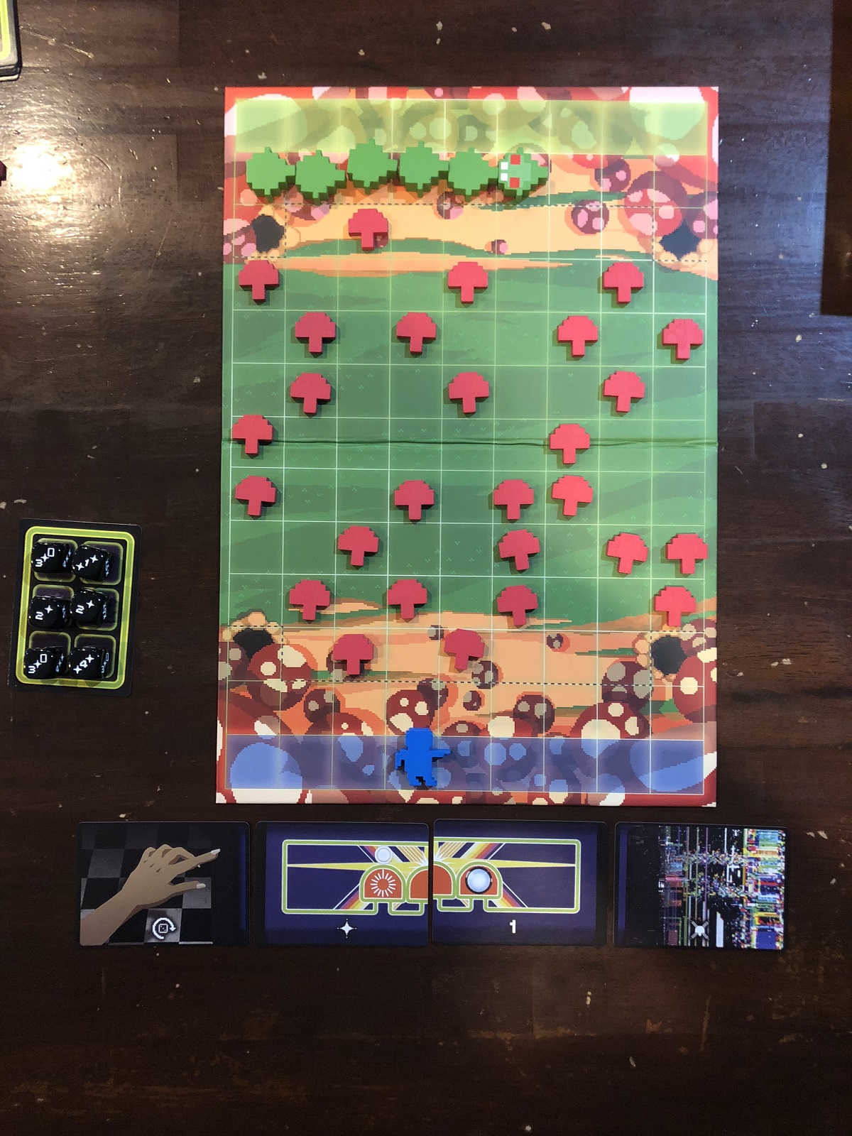 Meanwhile, the player has a specific set of dice that they use to move across the bottom and fire at you. You roll six D6 that all have numbers, diamonds that represent bullets, and numbers that tell you how many spaces you can move. Looking at the photo below, for example, one of the dice has two bullets and four spaces. You can choose to fire once, then move four spaces, then fire a second time for a turn. Once you use a die, it is removed signaling you used it for your turn, and you don't get to reroll any of the dice unless you use a player card or are down to one D6. The player also has four cards at the bottom that act as special abilities, giving you bonus actions to use at any time, but you don't get them back unless you have a die that had a picture of a card on it to return it to play.