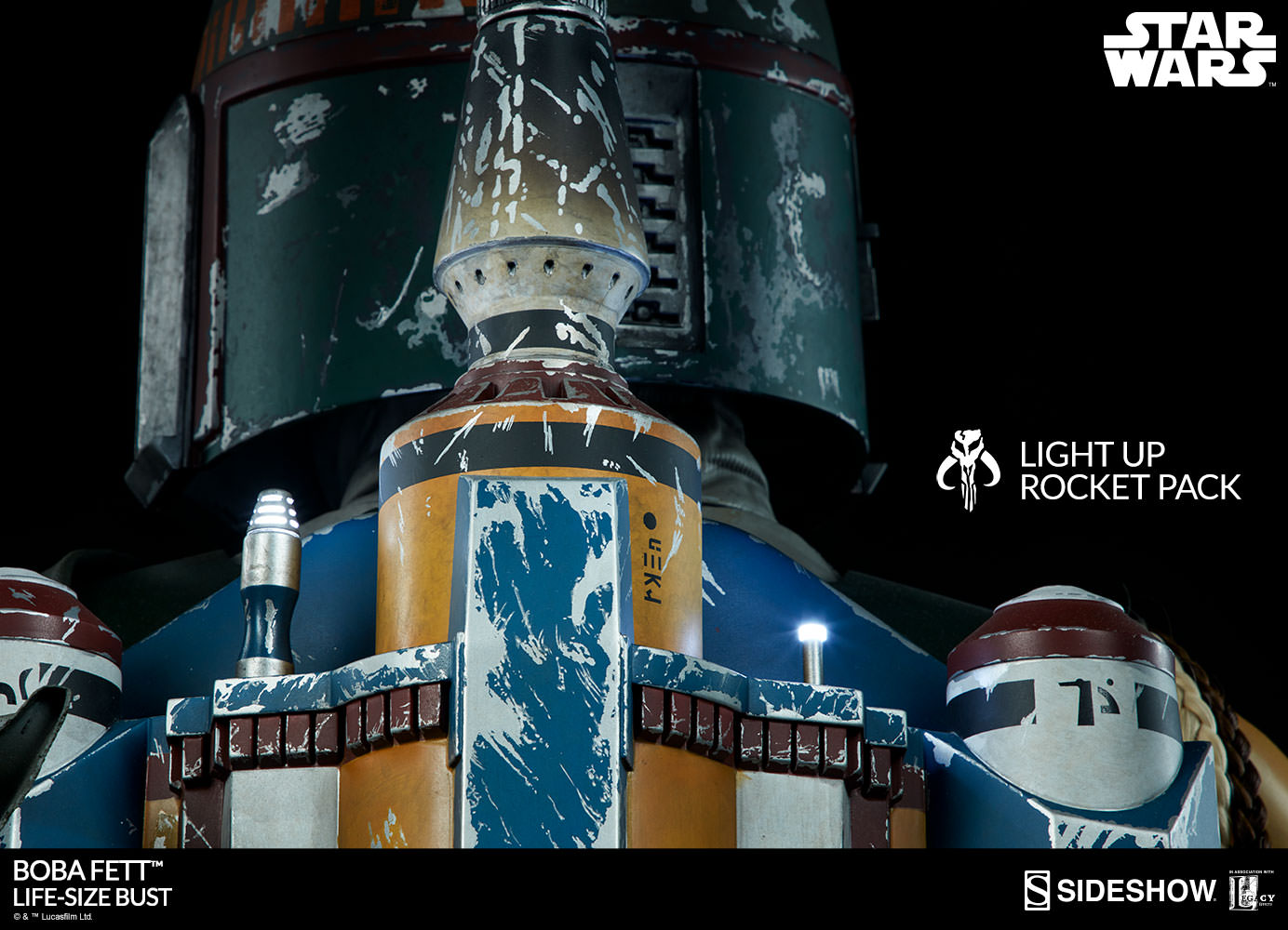 Boba Fett is crafted from fiberglass, polystone, and aluminum. His rocket pack and chest armor include light-up elements, allowing you a variety of options for displaying this piece in your home.