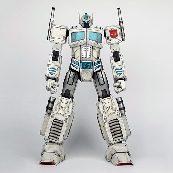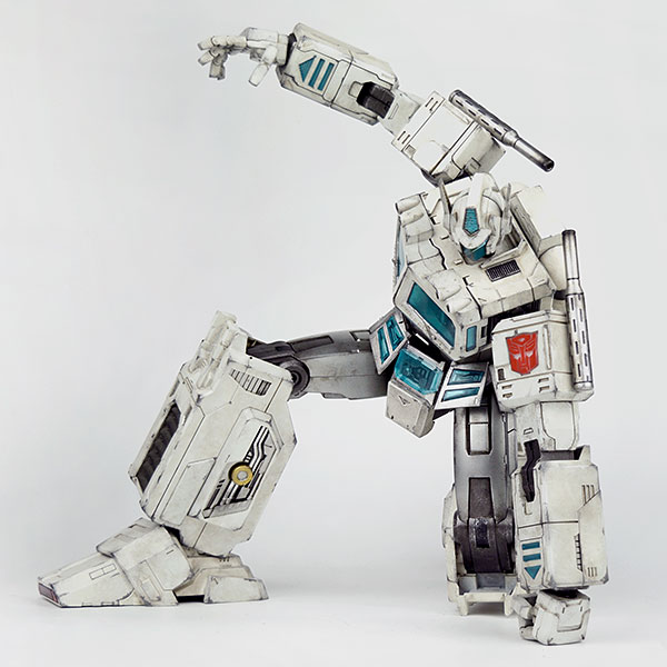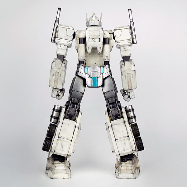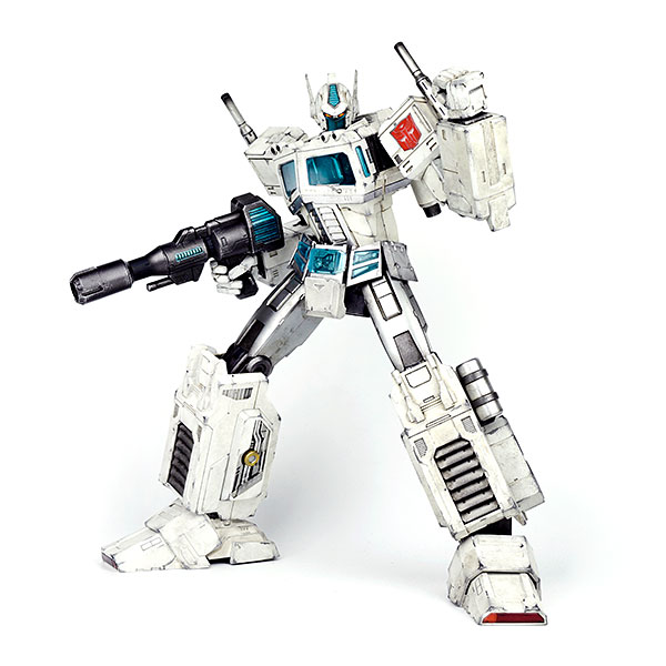 The first thing to take note is that this is about as detailed of a model as you're going to get from the Transformers, as this is a special white and blue-skinned version of the G1 version of the character, although he is slimmed down from the Magnus look of the series and has been given a bit of wear and tear to his 59 points of articulation. At first glance, this is a very menacing version of the classic Optimus Prime, as if he were a Decepticon (even coming equipped with a gun). Just based on design, this is a unique version of the character to have, from the chest plate windshields all the way down to the boots.