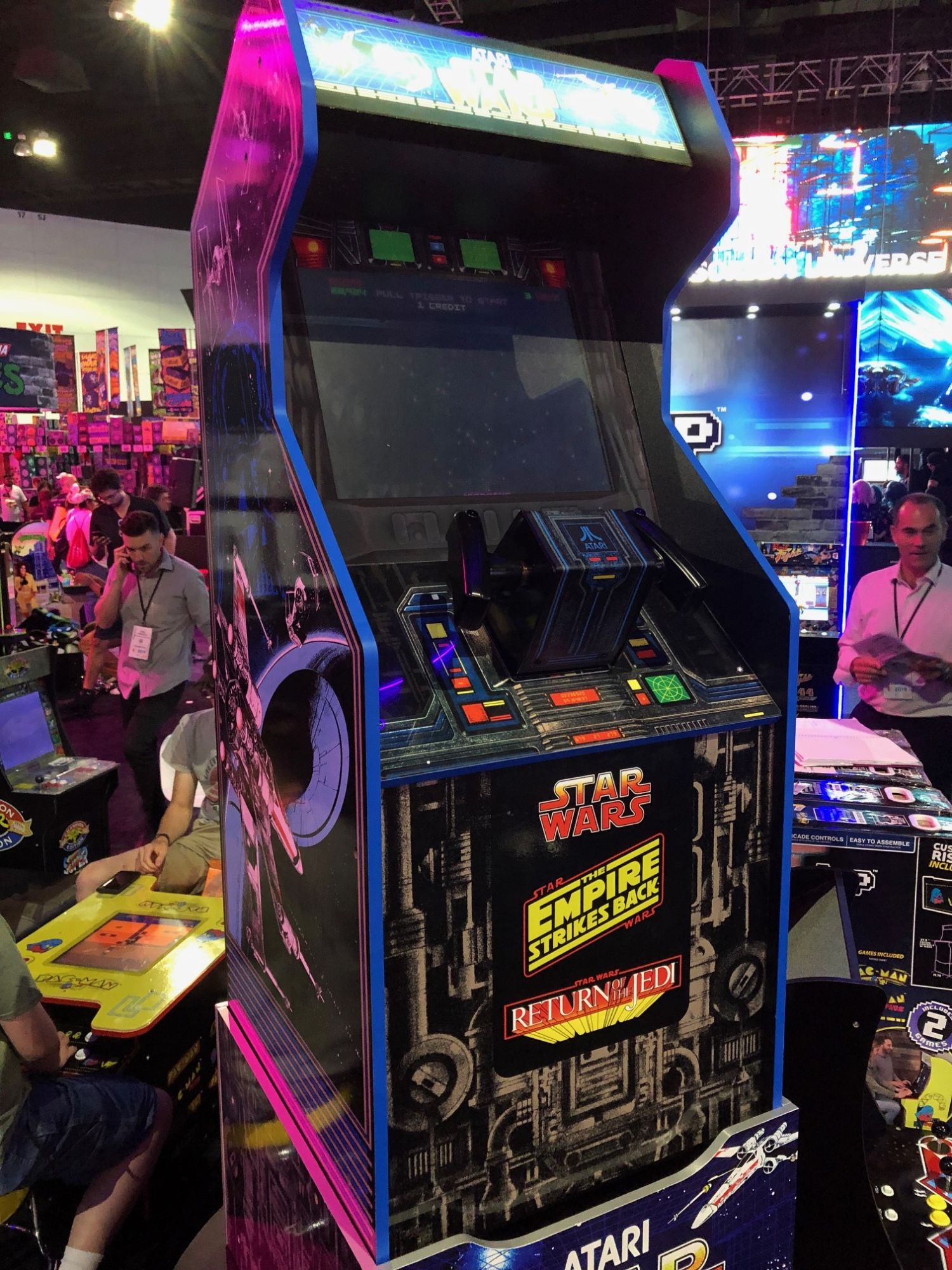 The big item they showed off during the convention was the fact that they got the rights to do the old Star Wars arcade cabinet with the old TIE Fighter controller on the front. This is about as close to the original 1983 model as they could get, and it includes all the arcade titles made in the '80s based on the films. We weren't able to play any of it because what you're looking at here is just the floor model. But I'm looking forward to seeing these guys again to try it out next time.