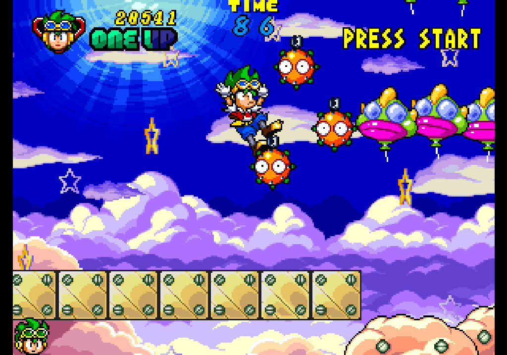 Ryuichi Nishizawa, game creator and founder of Wonder Boy, has led development of the game that encapsulates the spirit of and story about a boy, a girl and a robot in the near future, crushing the ambitions of enemies who plan to take over the world. Clockwork Aquario, a two player couch co-op, focuses on colourful, eye candy presentation, fun and fighting off enemies. Non stop action, cavorting from one platform to another, fending off endless attacks, be they from the sky or along the ground…. No stopping to admire the beautiful settings. Bash, stun, jump on the enemy and throw them away, and collect bonuses as the battles continue.