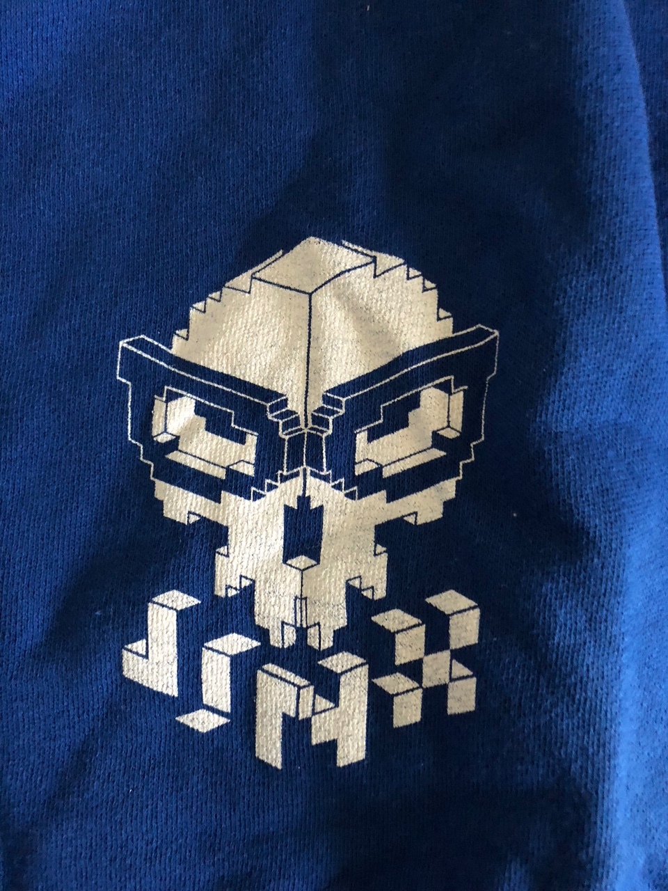 Because it's a zip-up hoodie, you get the pockets on the front that are pretty well sized. When we look at hoodies, one of the big things for us is to determine how well you'll be able to keep your hands warm, and these work well. You can throw a wallet or a cell phone in here and still have space to place your hands and keep them bundled up. The front logo of the hoodie is a pixel skull design put on a 3D plane to mimic a cube design, which works really well to show off it's a Jinx hoodie right from the get-go.