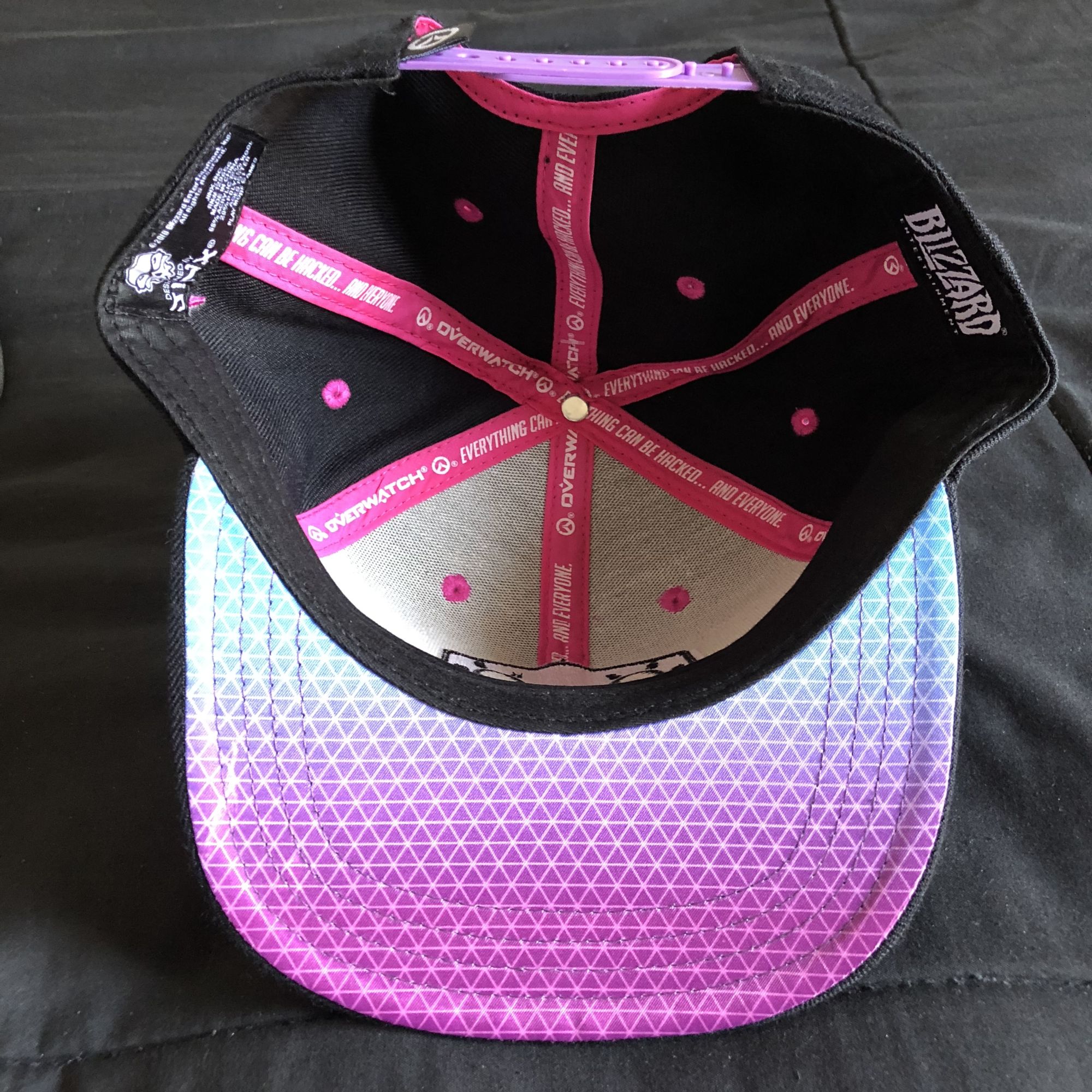 Taking a closer look at the D.va one from this set, you can see the attention to detail on her symbol and the work they did to make sure her logo from her MEKA matches up with the side. On the inside, you can see the message "Play To Win" on the hat bands all the way to the point, with a lovely shade of hot pink for the bill. All of these were made to fit the character, and if you happen to purchase any of the Ultimate Hoodies that match these characters, you'll see the color compliments each one.
