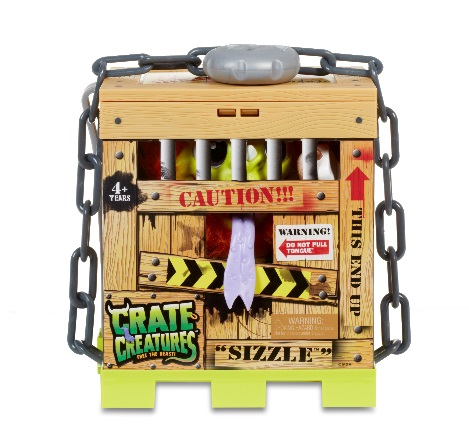 Break into the crate to unbox your new BEAST friend, Crate Creatures Surprise! Use the crowbar to break your mystery creature out of their crate to unlock their special creature feature. Watch your Creature vibrate, scream and eyes glow when you pull his tongue. Feed him his favorite food to hear him chomp away and pull their tongues for monstrously fun sounds and gross noises. Record and yak back phrases with your Crate Creatures! Available at all major retailers
