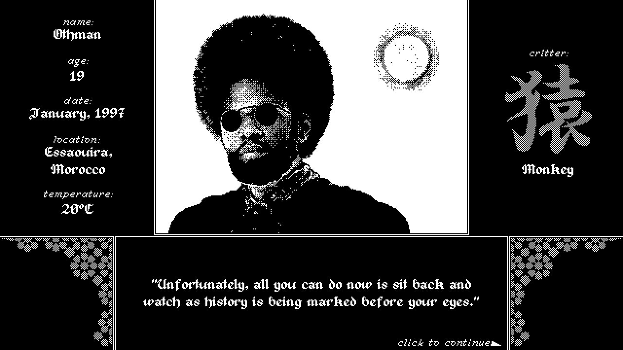 The story unfolds in five episodes, playable in any order, taking you on journeys influenced by the surreal horrors of Middle Eastern and North African folktales. With multiple endings each, you will be able to live and relive the dreadful terror depicted throughout Critters For Sale. The game draws inspiration from The Twilight Zone, Twin Peaks, Arabian Nights, and other works in the surreal horror genre. As well as games from the monochrome Macintosh era and other point-and-click games from MS-DOS such as Cosmology of Kyoto.