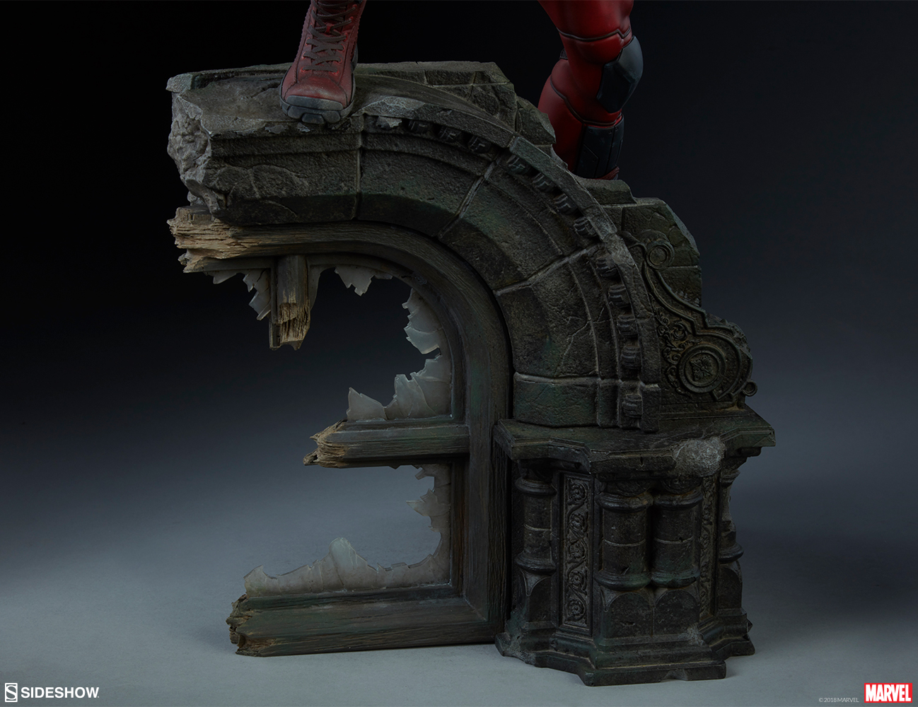 Daredevil measures 21" tall above the rooftops of Hell's Kitchen, lunging on a broken-window base inspired by the gothic architecture of the city he's sworn to protect.