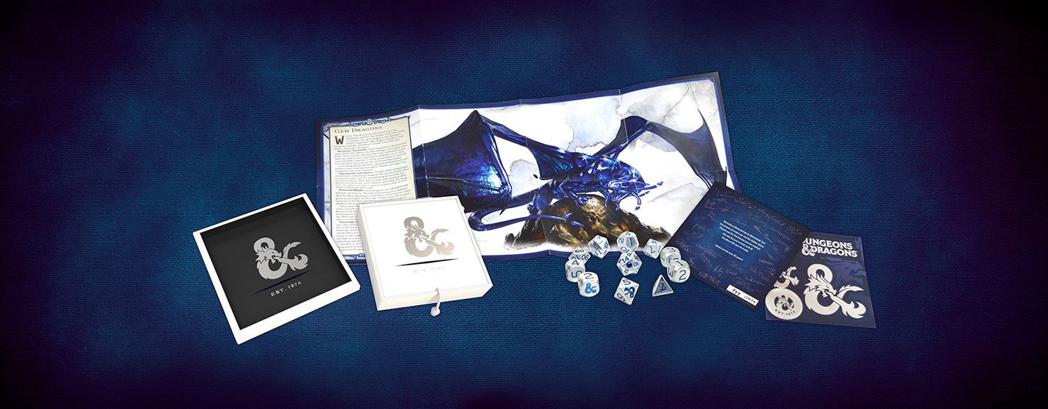 "When the D&D team realized the sapphire is the traditional anniversary stone for both five years and forty-five years, and that adding a laboratory-created sapphire to a twenty-sided die wouldn't jeopardize the integrity of a roll, we couldn't pass up the chance to make something really cool to celebrate the milestones" said Nathan Stewart, VP of the D&D Franchise at Wizards of the Coast. "The team put together a fun product for our fans that includes art and newly updated stats for sapphire dragons, making these classic dragons ready for play in your next D&D session."
