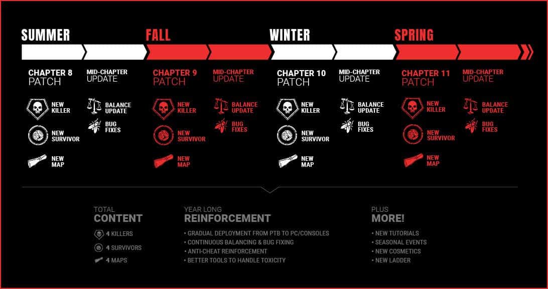 The new updated map shows plans for the game's third year of content, which includes a brand-new killer every season, along with a new survivor and map each time they update. We'll see where it takes us, as there has been nothing revealed for the killer coming in the fall yet.