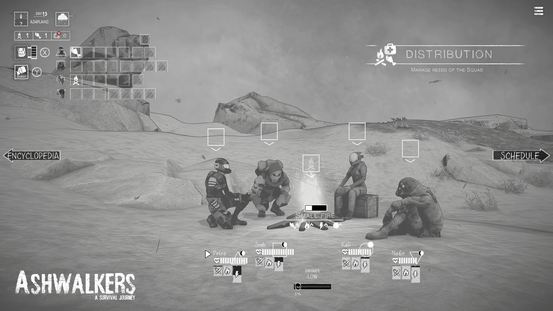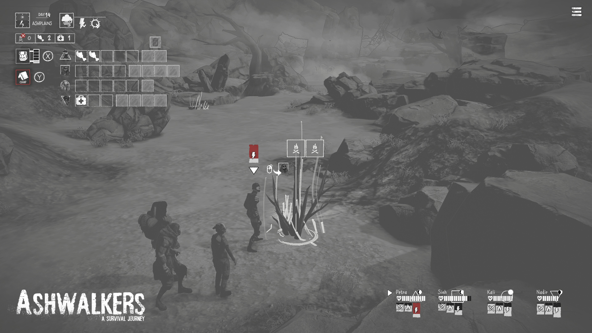 Ashwalkers is a post-apocalyptic narrative survival sim in which four adventurers set out to cross a ravaged Earth. Society has collapsed, leaving no moral judgement of the choices they make; only their personal integrity will guide them to one of 34 possible endings. The branching story challenges players to make meaningful choices in complex ethical dilemmas while managing their food, medication and other supplies. Set 200 years after the first geological disasters, a group of survivors called The Section set out into a devastated world. Their goal is to find a safe haven for their people, but to reach it they face a deadly journey through a post-apocalyptic wasteland. Players will get to know the intimate dynamics, relationships and tensions between the brave captain of the group Petra, the pragmatic fighter Sinh, the young optimistic scholar Kali and the cautious scout Nadir as they travel the end of the world.