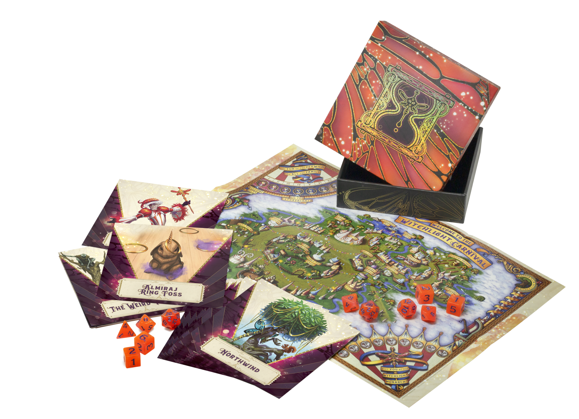 - A beautifully illustrated, double-sided player-friendly foldout map with the Witchlight Carnival on one side and carnival concept art on the other