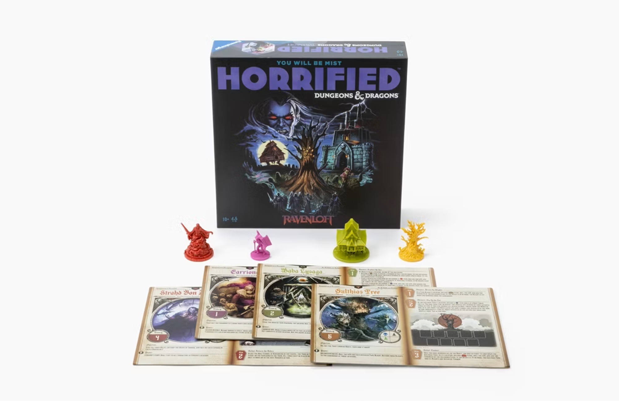 Horrified: Dungeons & Dragons – Ravenloft is the follow-up to Horrified: Dungeons & Dragons, and features four new monsters (Strahd, Carrionette, Gulthias Tree, and Baba Lysaga), a new setting, new hero classes, and new twists to gameplay. Choose your hero class and use teamwork, your unique class powers, and the custom D20 to outsmart the monsters and solve the unique cooperative challenges inspired by Dungeons & Dragons lore.