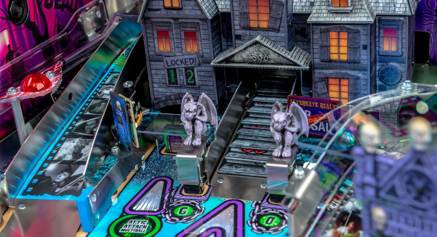 There's a few other B-movie creatures featured. Artist Greg Freres and Designer Dennis Nordman crafted a well thought out love letter to the Mistress of the Dark, and all the B-Movie camp one can handle. Fans can get the machine in either a Premium Edition, a Limited Edition, or a Signed Limited Edition (which comes with an Elvira autograph, a certificate of authenticity, and a swatch from her famous red velvet sofa). All three models feature six balls, three pop bumpers, Beast Booster Spinner, a "Junk in the Trunk" ball lock, interactive gargoyle statues, a "Hand of Fate" wheel, a Deadhead Family Crypt, the House of Horrors, Elvira call outs, and a unique feature at the end that shows the B-Movie footage players unlocked during the game. What do the LE models have, you may be asking? Different cabinet art, and a few more cosmetic differences. In all honesty, I have a premium edition. I don't feel like I'm missing out on the LE.