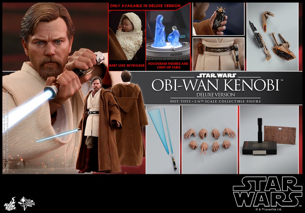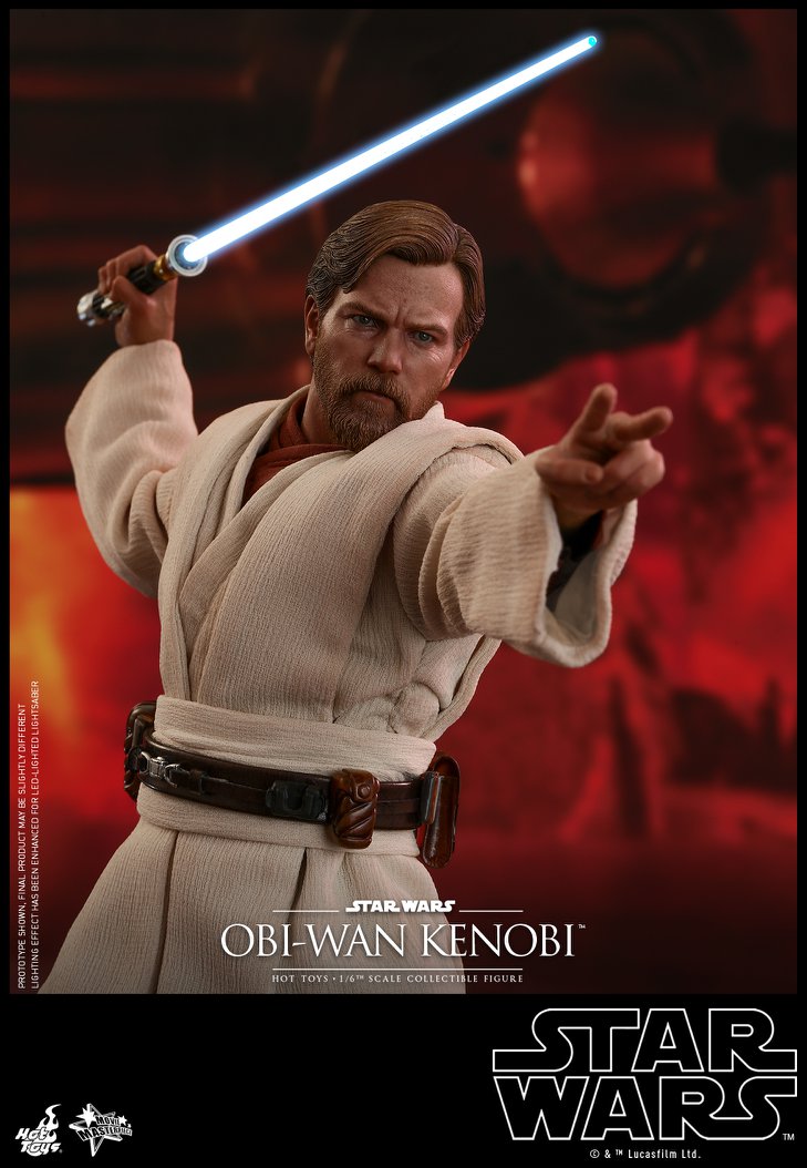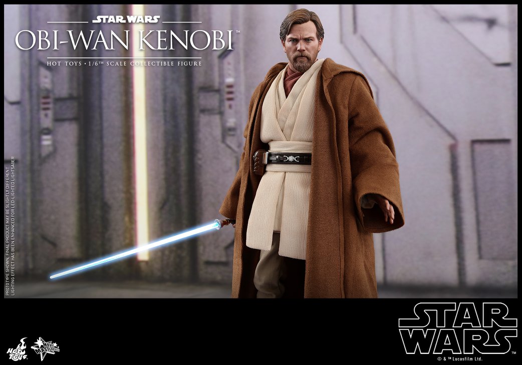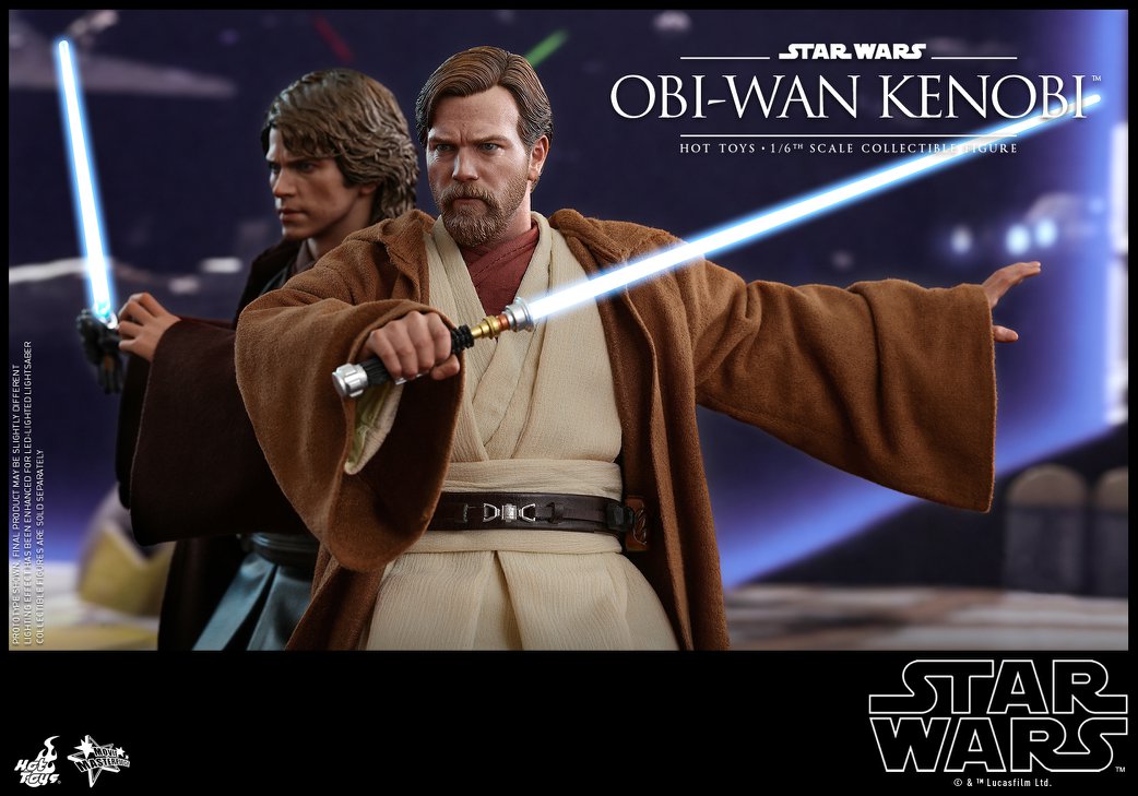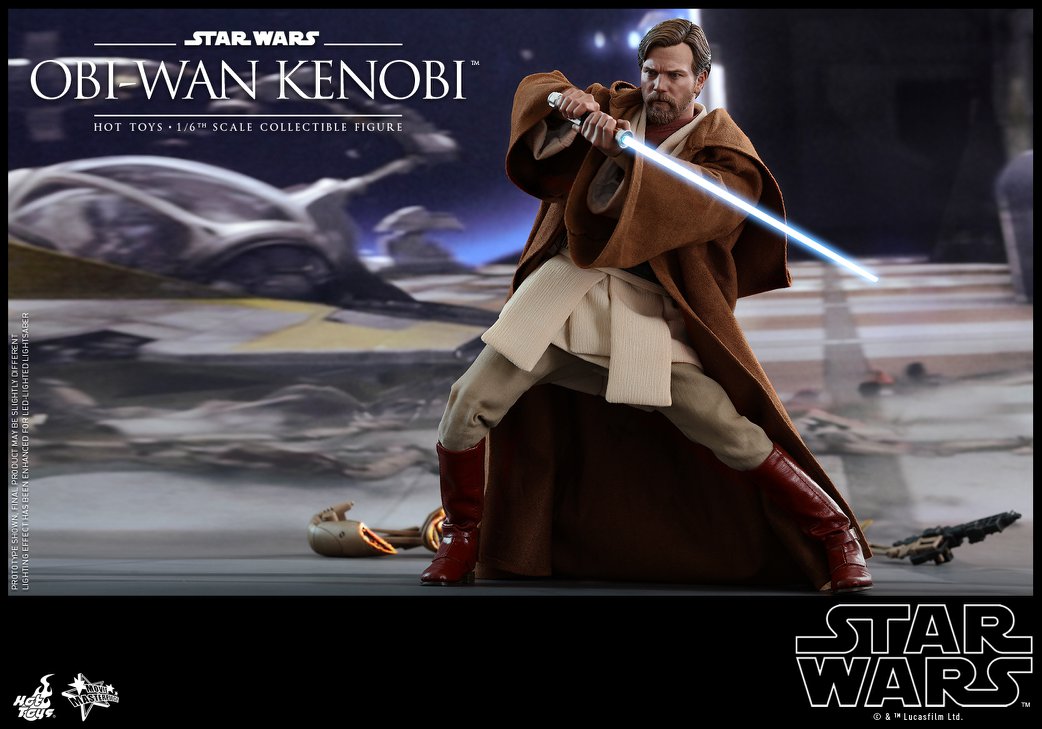 Sophisticatedly crafted based on the appearance of Obi-Wan Kenobi in the film, the 1/6th scale collectible figure features a newly developed head sculpt with stunning likeness, a skillfully tailored Jedi robe and tunic, a LED light-up lightsaber, severed battle droid parts and a specially designed figure base with interchangeable graphic cards!