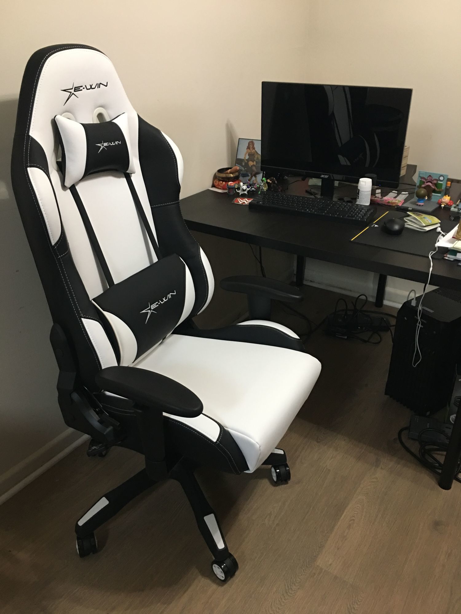 Last week I received a new addition to my home office: an EwinRacing Series gaming chair. Right off the bat I can tell you this is one of the nicest chairs I've ever owned. It got here fairly quickly — less than a week — and only took a half hour to set up. The directions are simple and to the point, so anyone can put one of these together–just be sure you have enough room to do so. I adjusted the set to what felt comfortable, and bam! Brand-new chair.