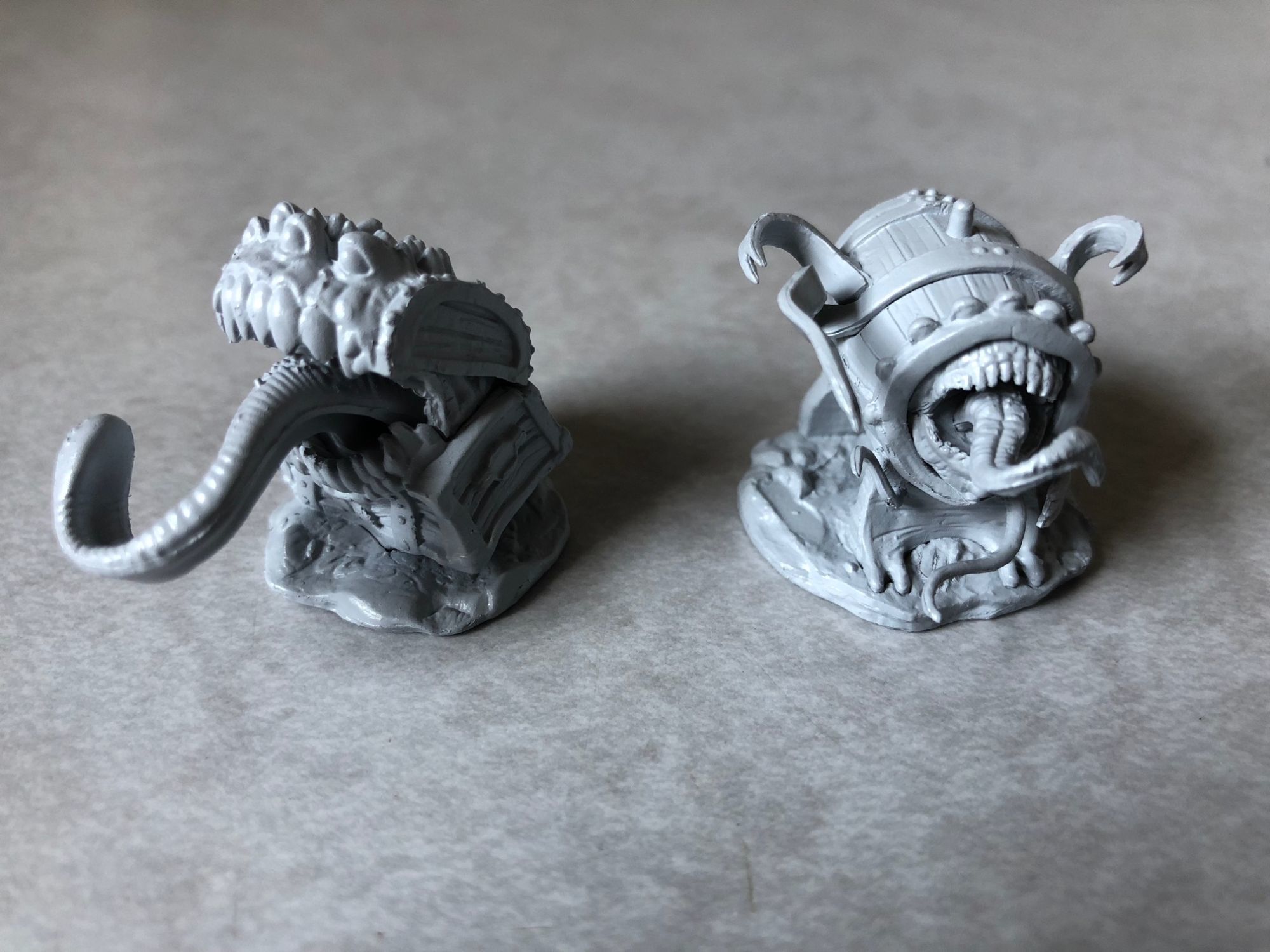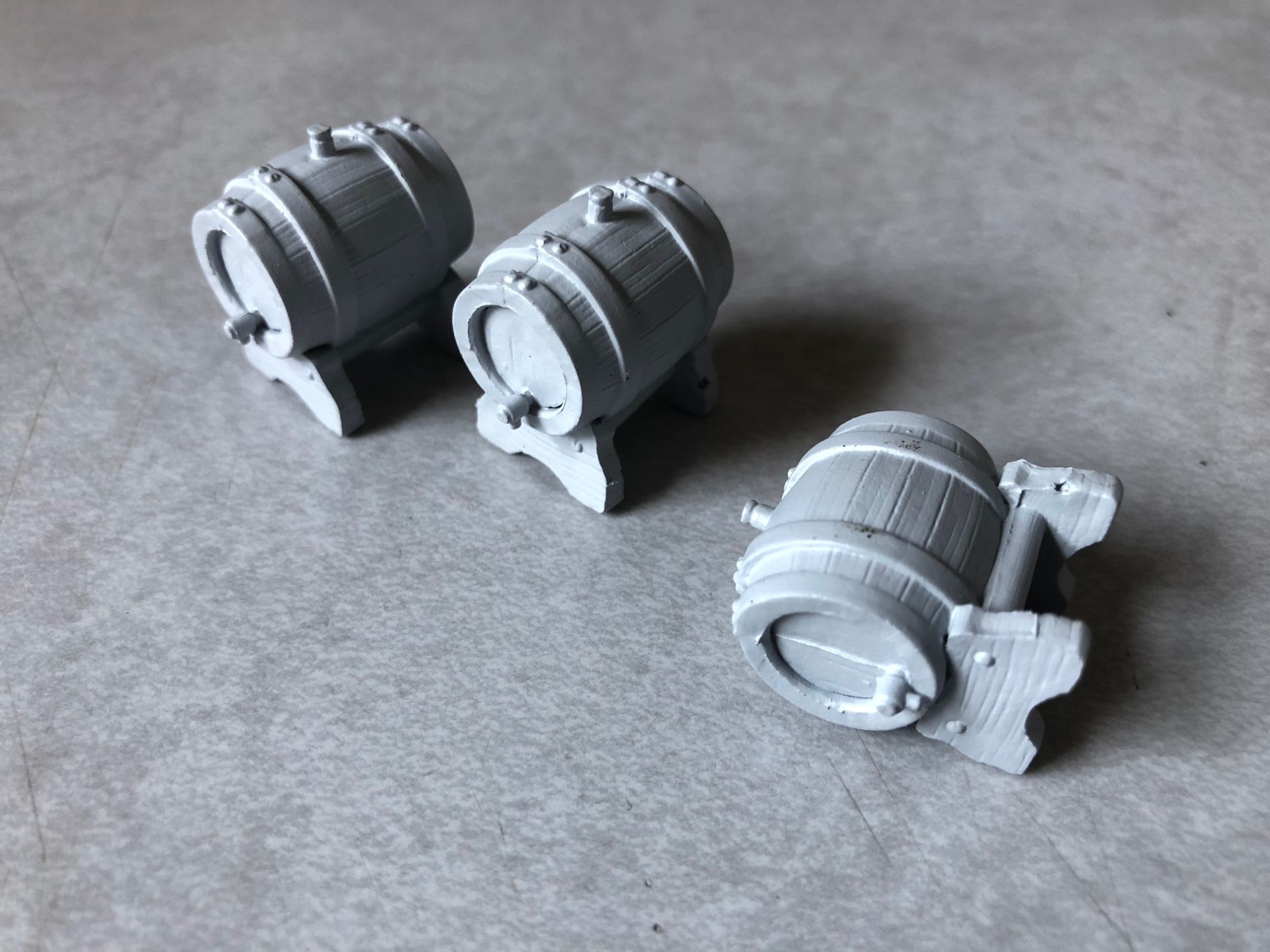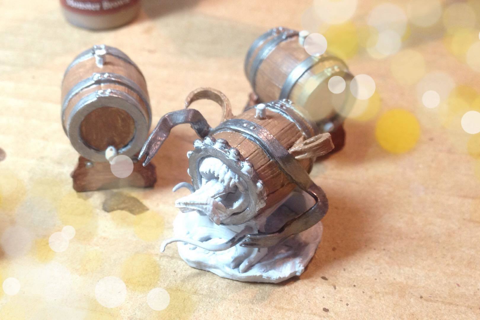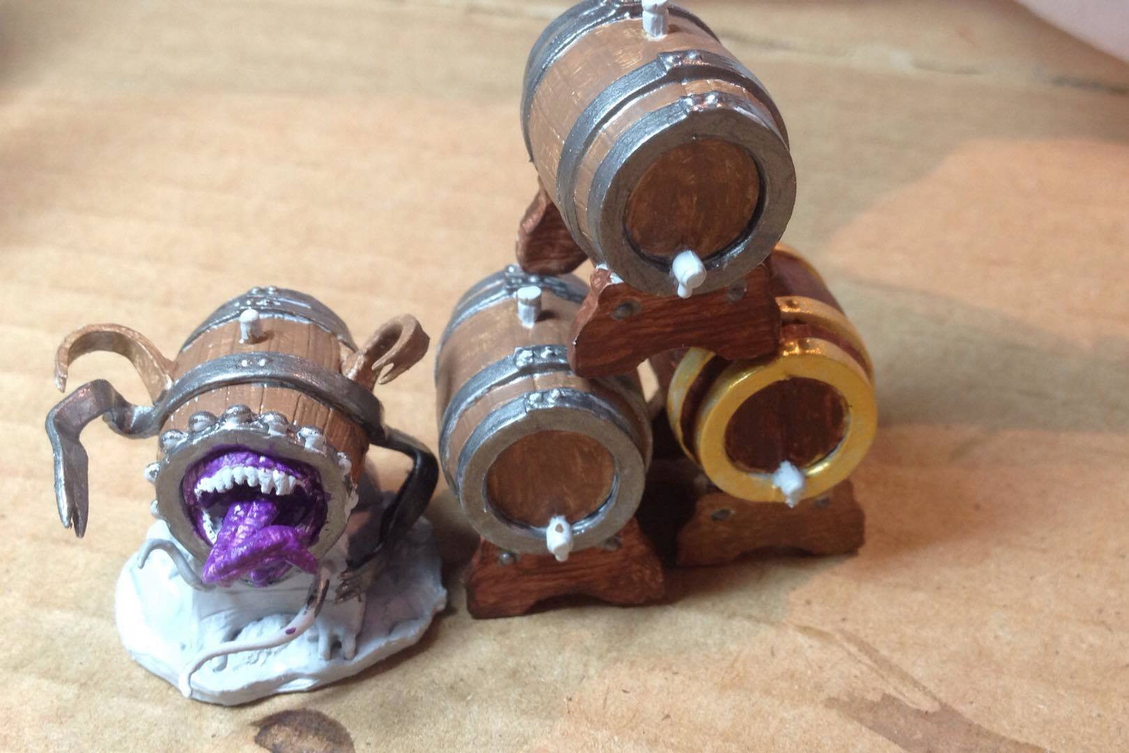 We'll start with everyone's favorite traps to avoid — mimics. Part of the collections we received was a pile of furniture, which included some kegs. This worked out beautifully, as the two mimics we received was that of a keg as well as the traditional treasure chest. When you look at the designs below, everything has a place for deception. The kegs by themselves look very standard and ordinary, as objects to be placed in the room as an obstacle or to add scenery. But any wise DM or GM will take advantage of this situation if the storyline suits it and place a mimic in the room to take shape and make the players' lives miserable.