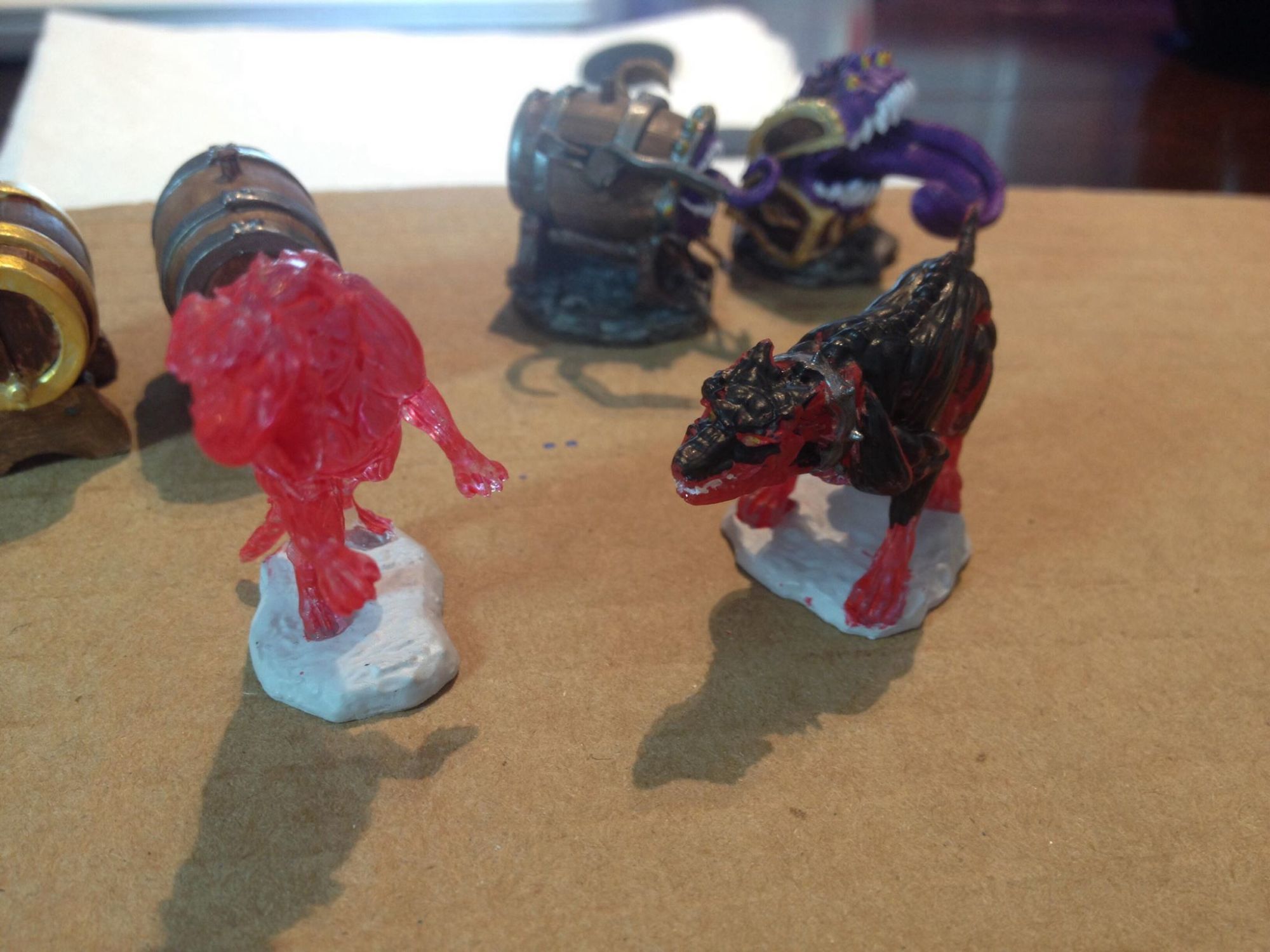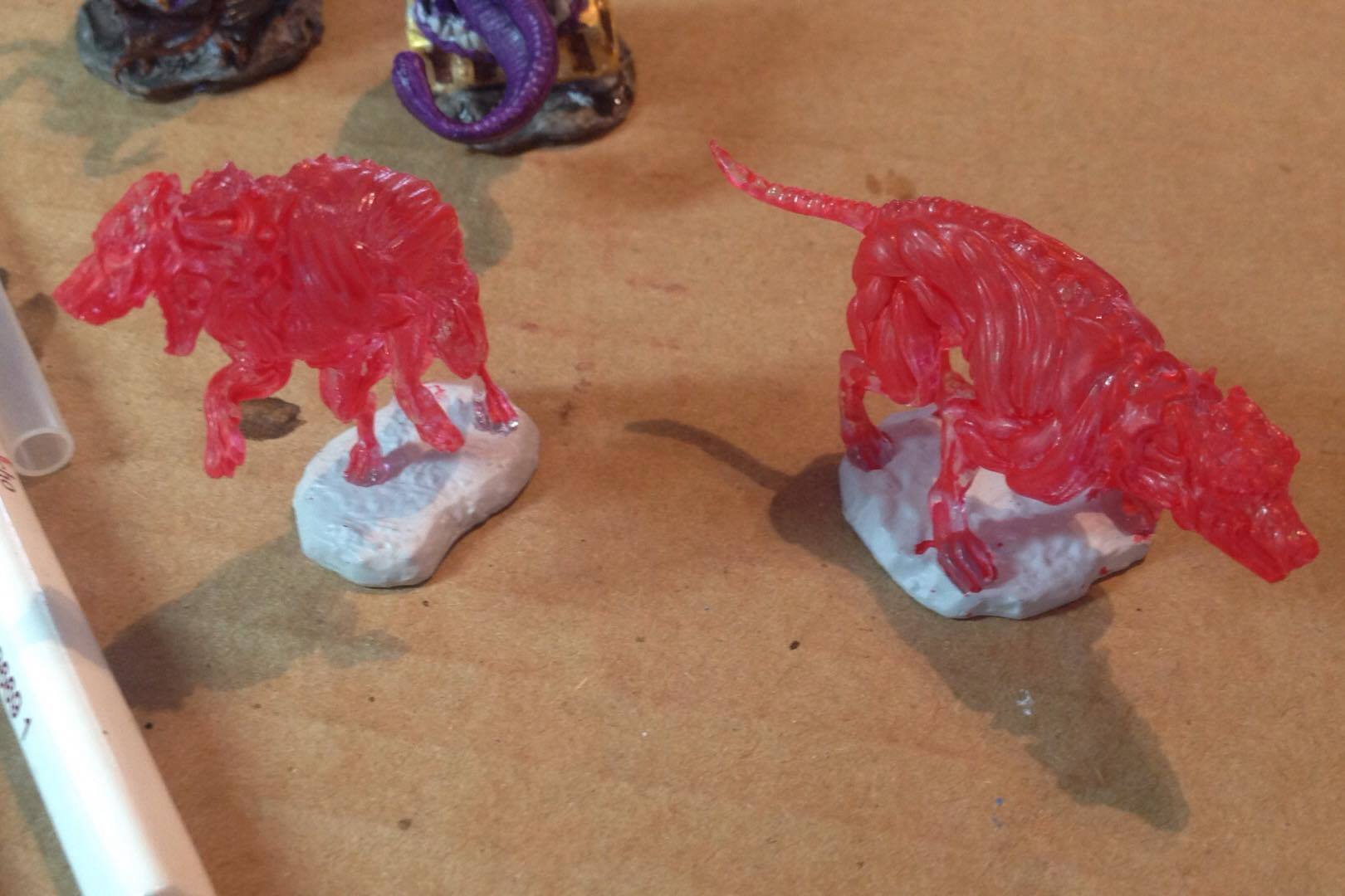 For the paint, Tony started with a deeper shade of red than you might expect; but because of the material, it comes out to be a regular kind of hellfire red. As he went into detail about the collar and the face, he made the tops of the dogs look like it was burnt lava. Aesthetically, this gives a double effect to the eyes of the player. On the one hand, you're looking at them as normal dogs who happen to be created from magic, so they retain a little bit of real-world look to them. On the other hand, you can interpret it as their bellies being full of fire that's constantly burning, so there are parts of them exposed to the air that while still hot, have cooled down and turned black. It's a very interesting dynamic that, as you can see below, works well with painted and unpainted figures.