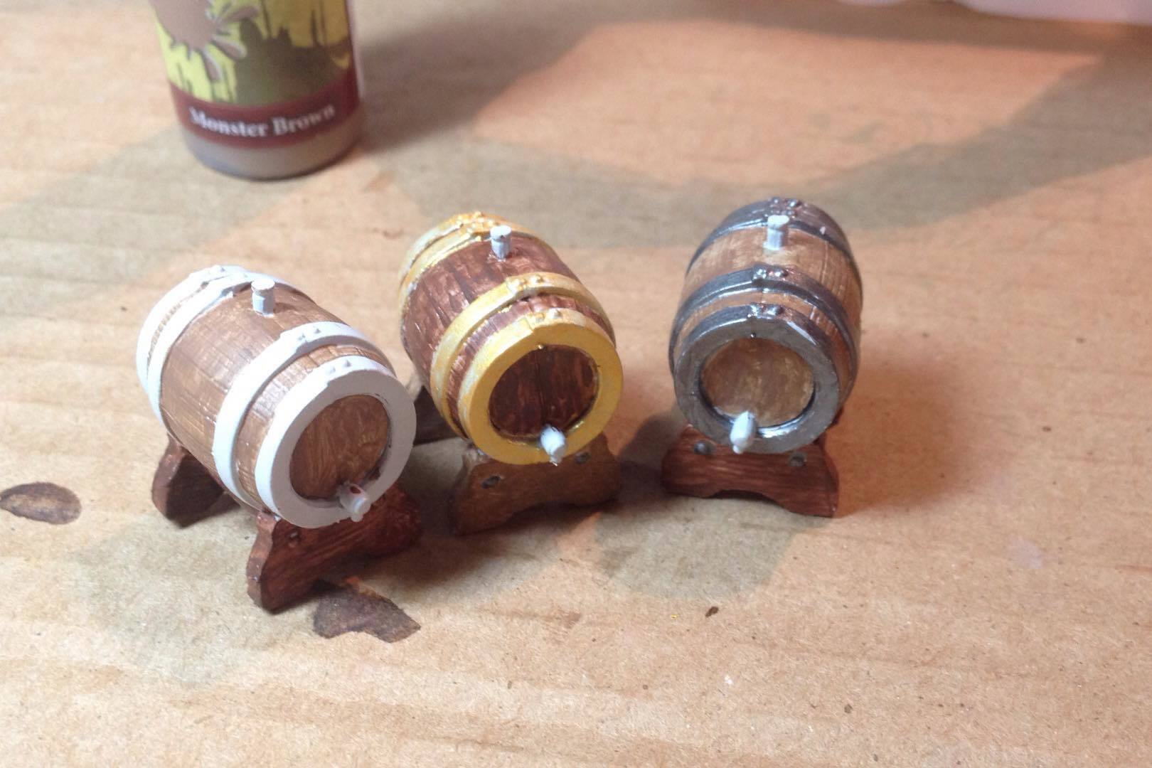 As you can see from the color choices he made below, he decided to make the kegs look like they were put together by different people, or perhaps designed in a way to let you know what kinds of ale or brews were inside each one. When he tackled the mimics, he made them more monstrous than you should expect to see in battle. When you get a mimic, you usually think of the open mouth with the purple tongue, while the eyes and other features don't come off right away in your mind. Here, by taking advantage of the bumps to represent the eyes, you're able to add in a depth of fear and hunger on the part of the creature. These are magnificent designs that you can have a lot of fun with, depending on how menacing you wish them to be.