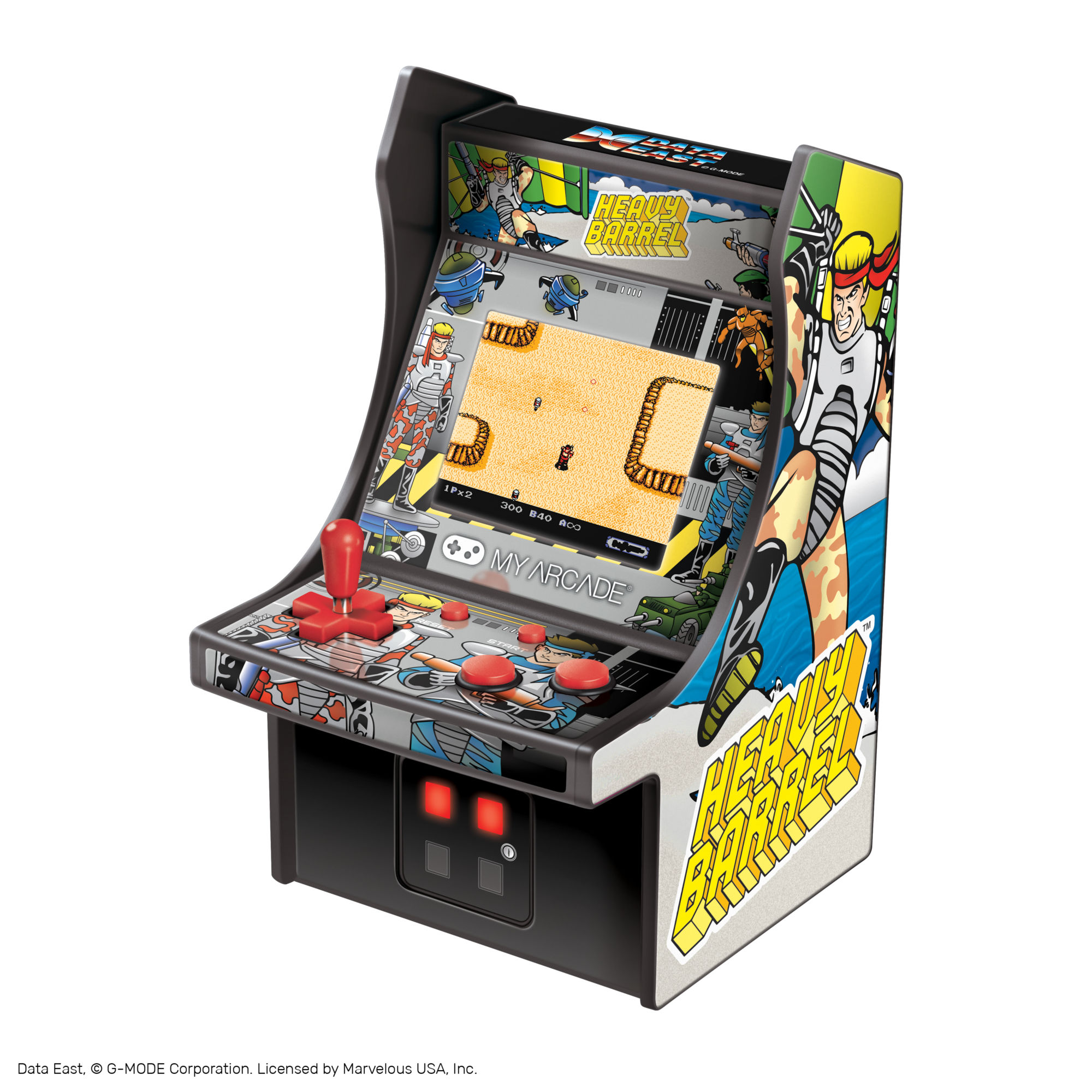 Next up, the company managed to work with Konami and get the license to make the old Contra arcade cabinet with the original version of the arcade game built in. This is their standard arcade version where it runs either on 4 AA batteries or a Micro-USB cable. And all of the graphics are like the original cabinet down to the poor sticker they used to have on the side because some arcade cabinets were built weird.