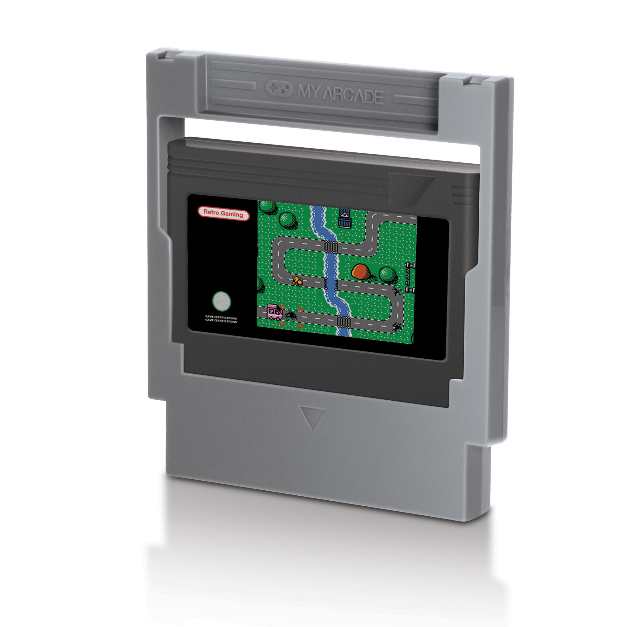 Every year that we go to E3, we love checking out all of the new gear that My Arcade has to show off, and this year was no different. The company was kind enough to give us all of these photos of what they had to bring, but we're primarily going to discuss all of the new stuff on the table. Starting here with the Retro Champ, which is a portable game console that plays both NES cartridges as well as Famicom cartridges. We got to try out a demo of it using both sets of games and man does it play these well. It has a full color 7" screen with 3-5 hours of playtime on rechargeable batteries. Plus a built-in kickstand and it can hook into an HDTV with an HDMI cable as well. If you happen to have My Arcade's Super GamePad controllers, you can hook those up as well and play wirelessly. It also comes with a cleaning kit for old cartridges.