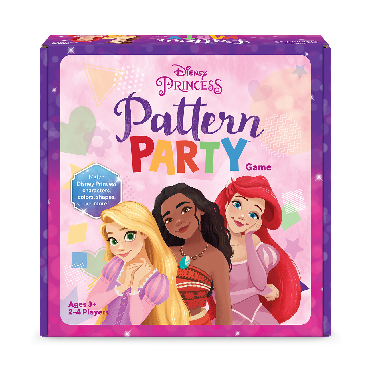 Disney Princess Pattern Party Game: Go for a spin with five of your favorite Disney Princess characters! Spin and match the character, color, shape, or pattern. Each player gets their own spinner and whenever someone spins "SWAP!" you all switch spinners. Match the four squares on your goal card to win! Spin, match, and join the party! (MSRP: $15.99, Ages 3+, 2-4 Players, Spring 2022)