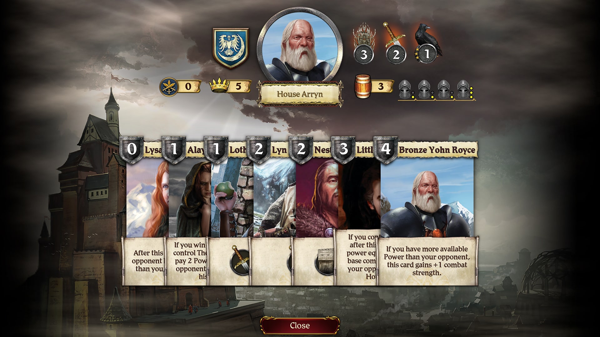 - The House Arryn disrupts the usual balance of power by occupying otherwise empty sides of the map, with unique cards betting on influence and changing up the gameplay from the other Houses.