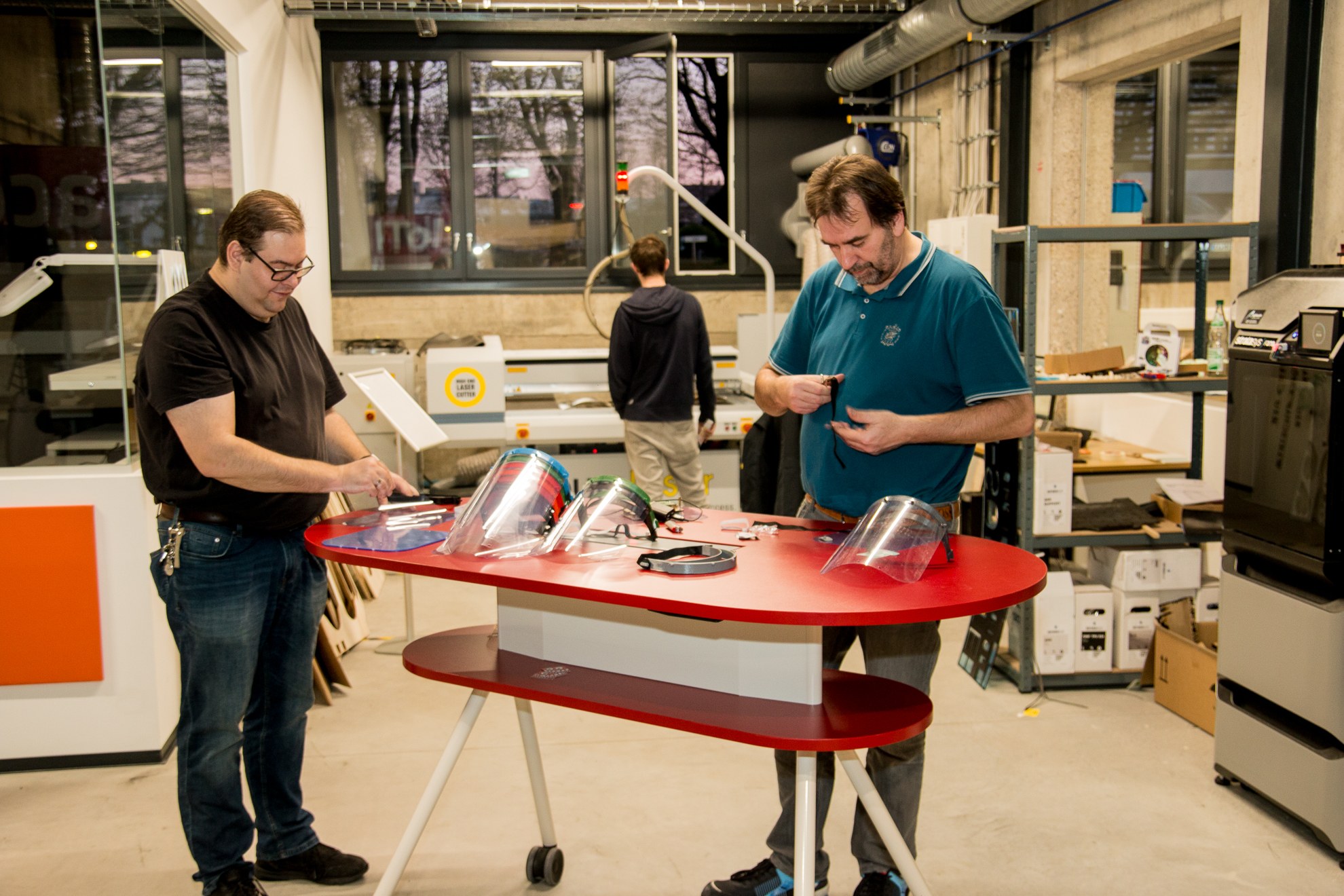 FabLab's volunteer members are manufacturing high-quality face shields, meant to be worn by medical personnel in addition to respiratory masks, to provide maximum protection from droplet-based infectious material. While the plastic shields are cut out by laser, other volunteers are using their personal 3D printers to make the requisite holding frames at home. Finally, all components are assembled at FanLab Bruchsal by a smaller team – to keep the risk of infection to a bare minimum – and sent to medical facilities in need.