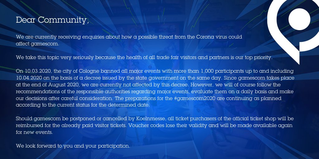 The statement below was released on Twitter, letting the community know that while the city of Cologne has banned events of over 1,000 people, it has only done so through April 10th, 2020. And while they are monitoring the situation, their event doesn't take place until the end of August. A lot could change around the world between now and then. So until we get closer to the event, it appears they are moving forward with their plans until it gets to a point where they have to cancel. We'll see if other conventions around the same time of year, such as G-Star 2020 and PAX West 2020, will do the same.
