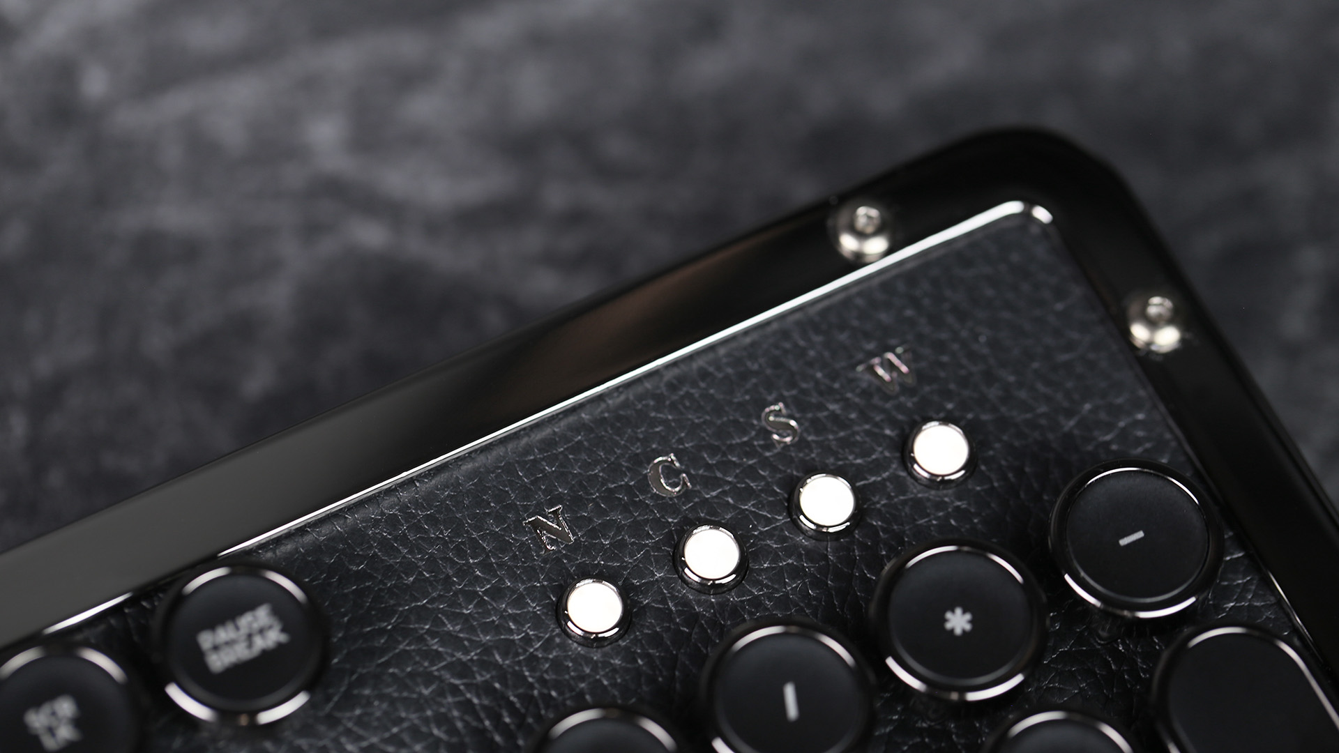 The keyboard comes with two stands in the back that twist counter-clockwise to raise the keyboard up on a slant and roll back clockwise to rest flat. It's a nice design that actually reminded me of ink ribbons, so that was a nice aesthetic. The edges have a metal plate that adds in a metallic feeling, while the underplate is genuine leather. This was meant to look like a keyboard someone would have bought if PC gaming was invented 50 years ago. Part of it feels like a typewriter while part of it feels like a briefcase. The top right corner even comes with four lights with lettering above them to indicate Nuu/Caps/Scroll/Win key locks. A lovely bonus is that this works for both Mac and PC, and comes with interchangeable keys you can pop in to make a Mac configuration. That's a key element a lot of companies ignore or force you to buy extra parts to do.