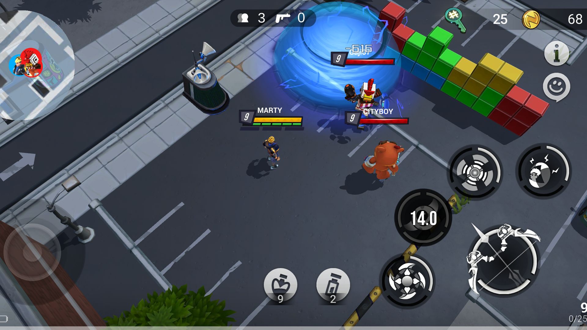 To make a more accessible battle royale, nWay designed Battlepalooza's combat system to reward players who utilize a blend of strategy, skill, and luck — not just reaction time. The game takes the inventory and equipment loadout system of RPGs and the mid-match player progression of MOBAs (multiplayer online battle arenas) to add strategy and depth, making it more accessible to a wider variety of players. The game uses a top-down camera view for easier navigation and features diverse sets of powerful items, consumables, weapons, and skills — including the gravity bomb, cannon bots, invisibility gear, drones, warp potions, barricades, and much more. Players will need to think strategically to select the most advantageous gear and skills to equip before entering into battle.