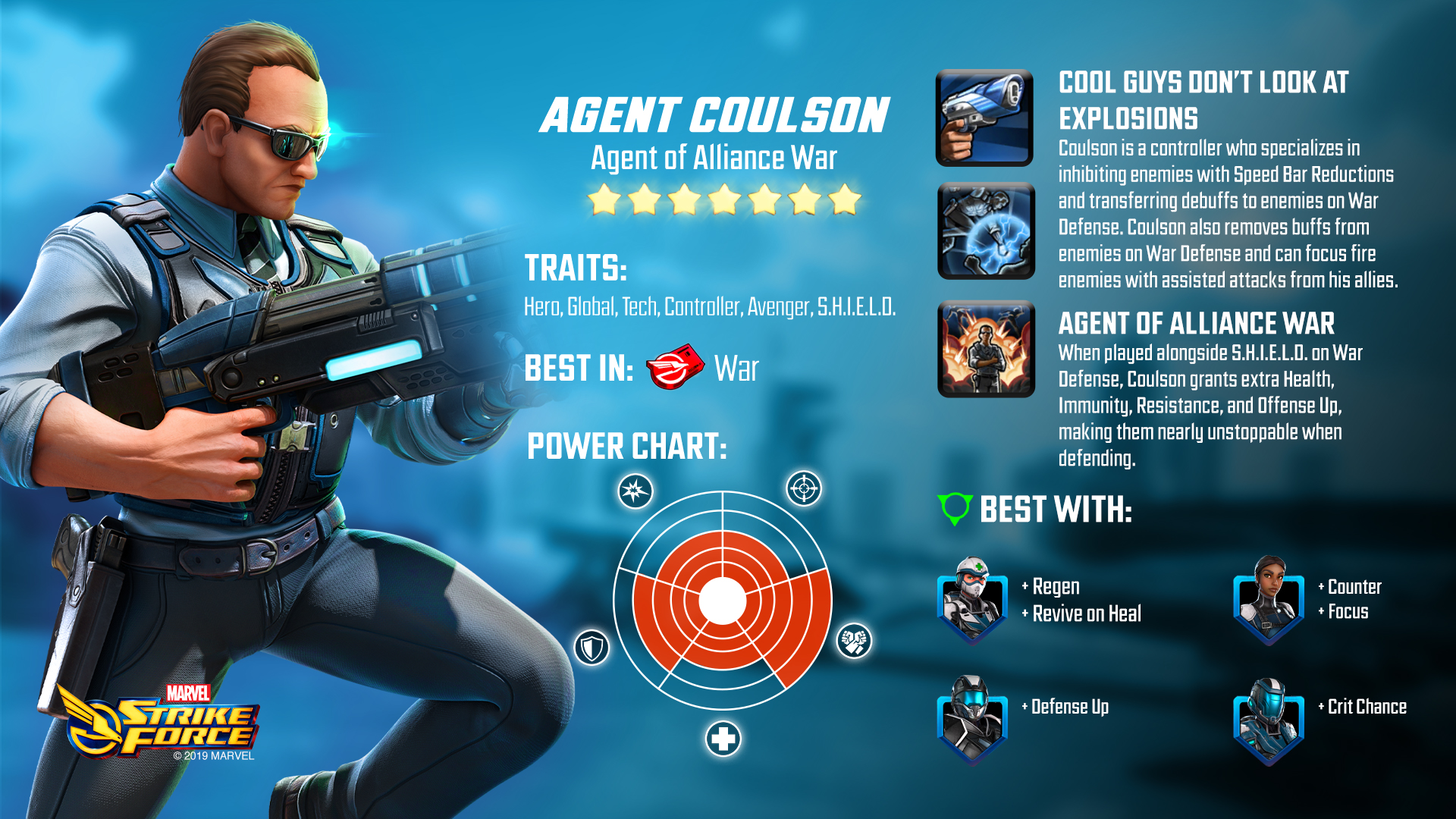 Agent Coulson, as the newest Agent of War, players can utilize Agent Coulson to assist fellow S.H.I.E.L.D. allies in Alliance War Defense and always revive's on S.H.I.E.L.D. Medic's heal.
