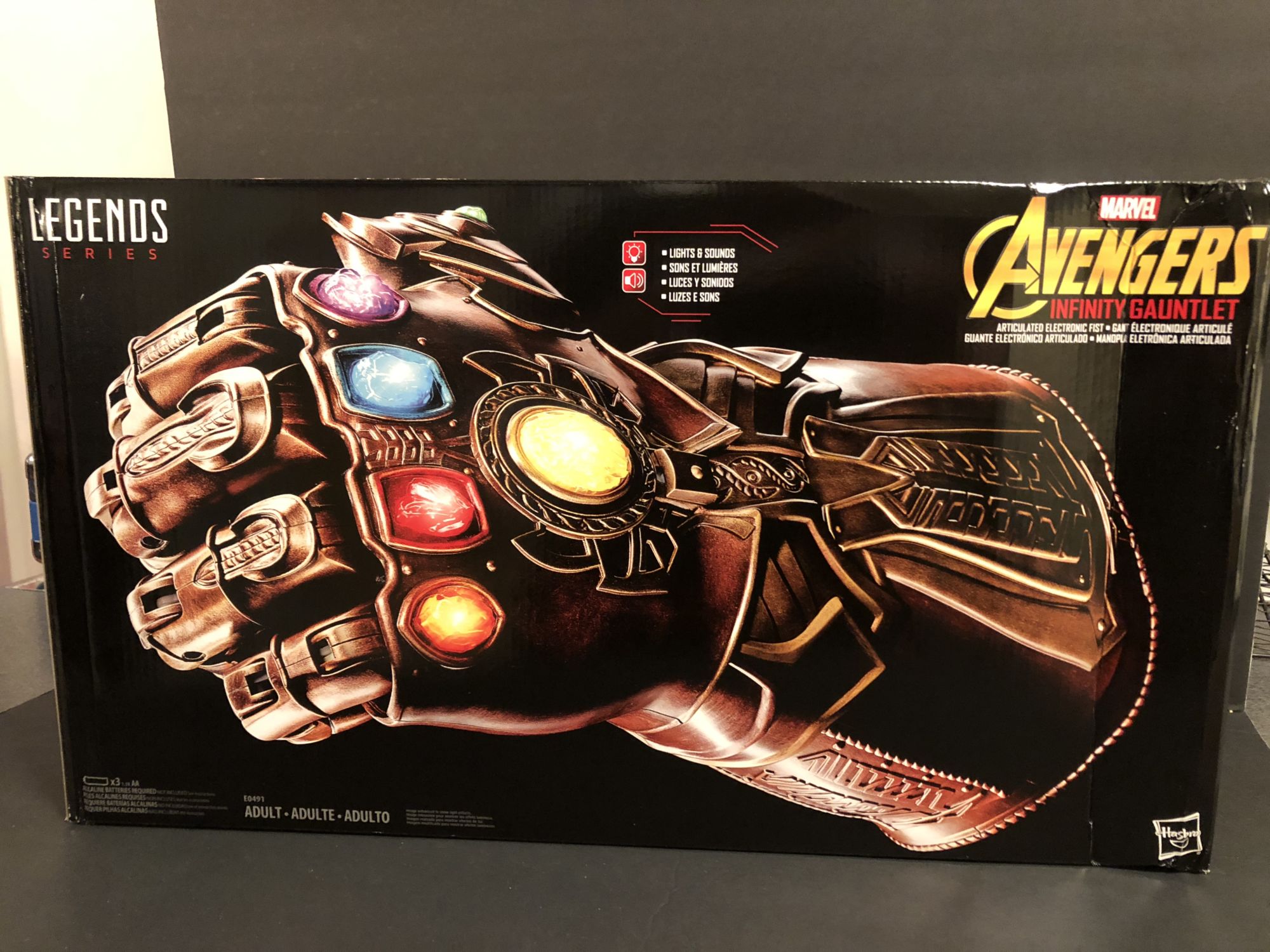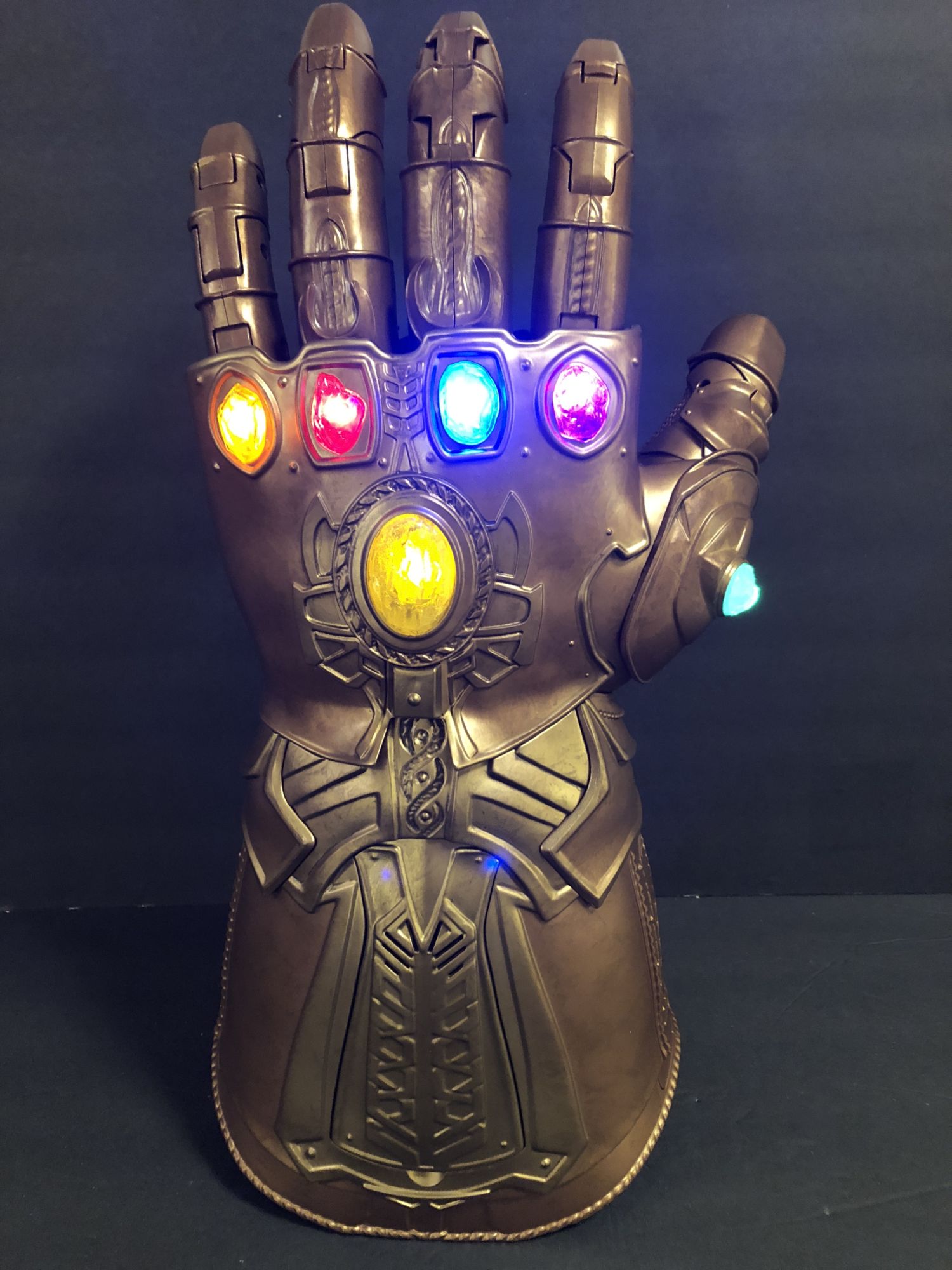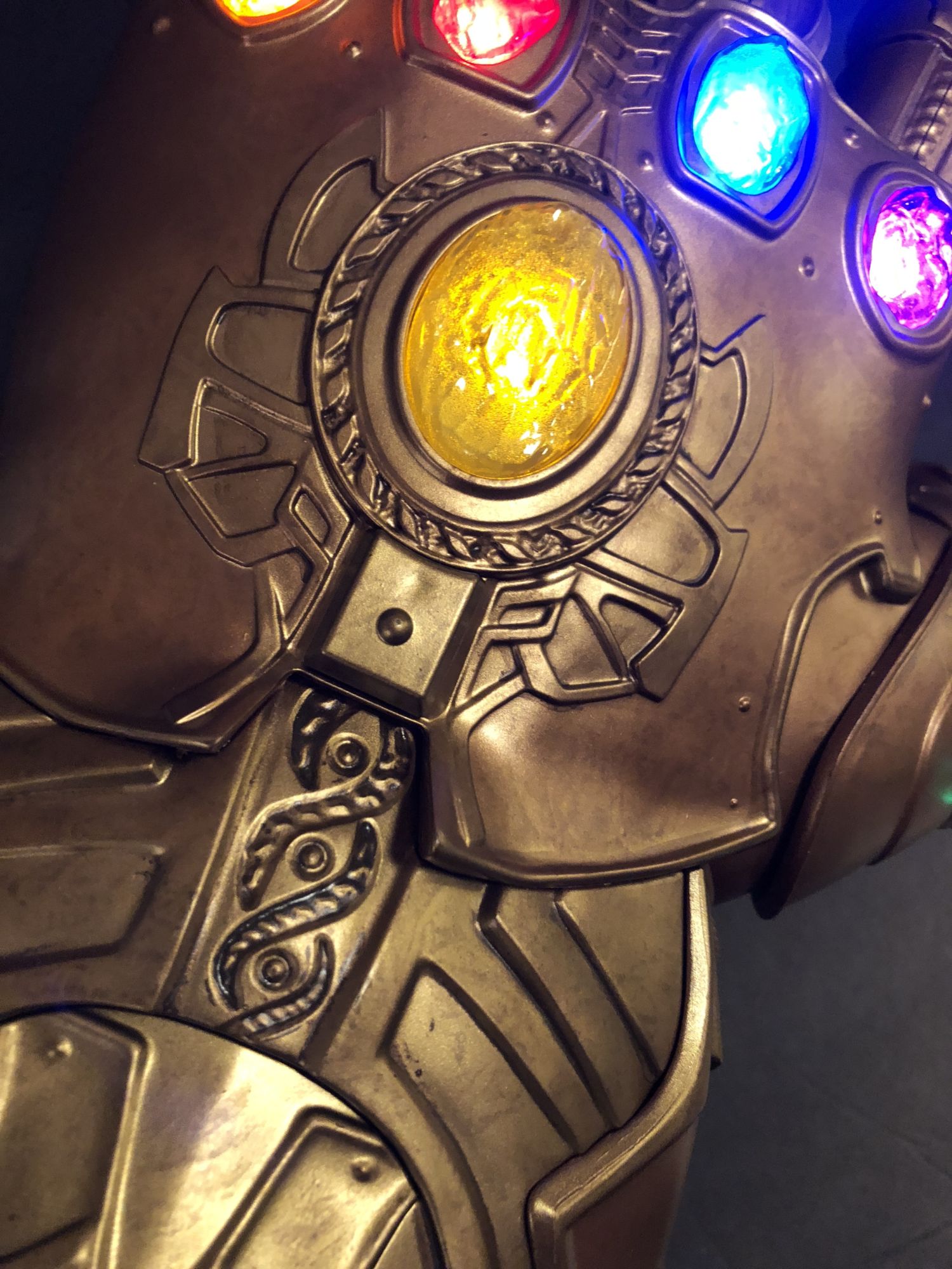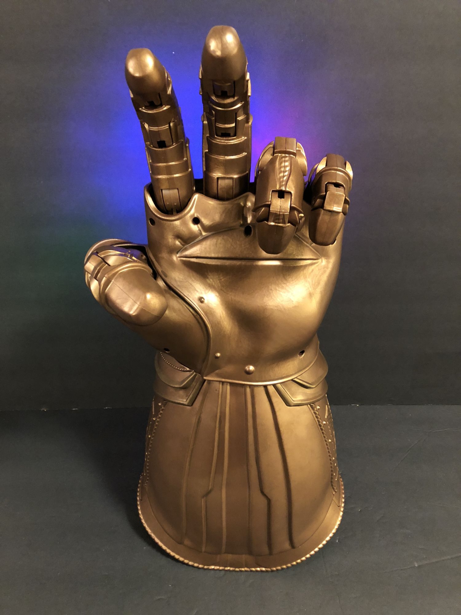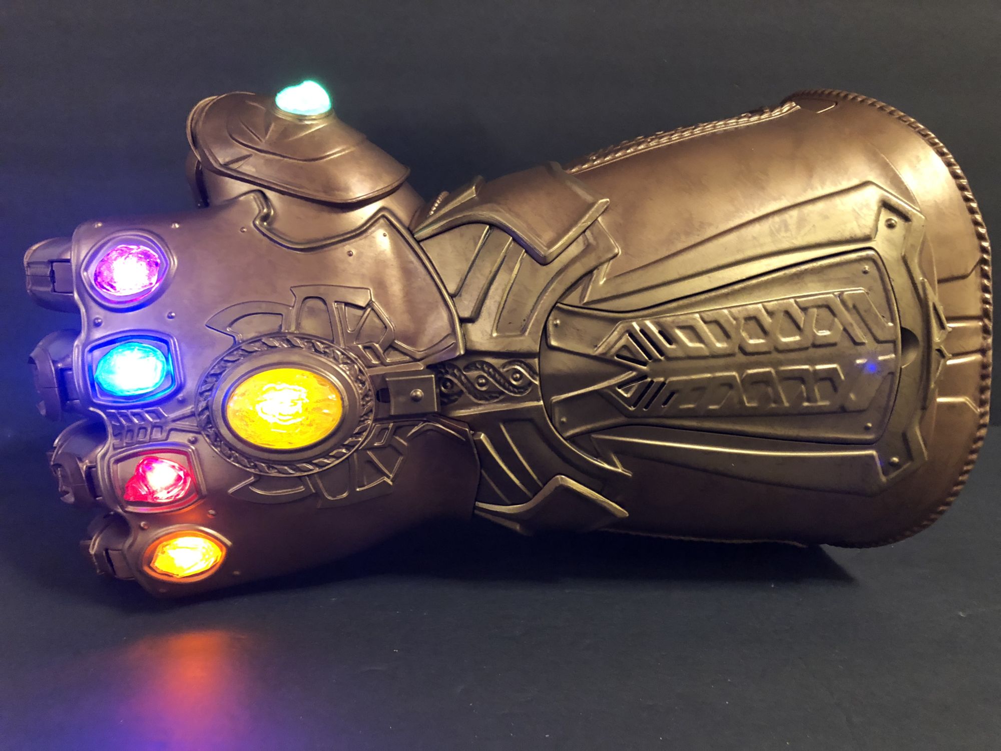 Right out of the box, the heft of this thing is surprising. Like all of the role play items, this is 1:1 scale, so authentically sized to the way it will appear onscreen in Avengers: Infinity War in May. Hasbro even got the sound clip straight from Marvel Studios so that it matches what we will all be seeing and hearing when Thanos makes his grand entrance and begins assembling the stones.