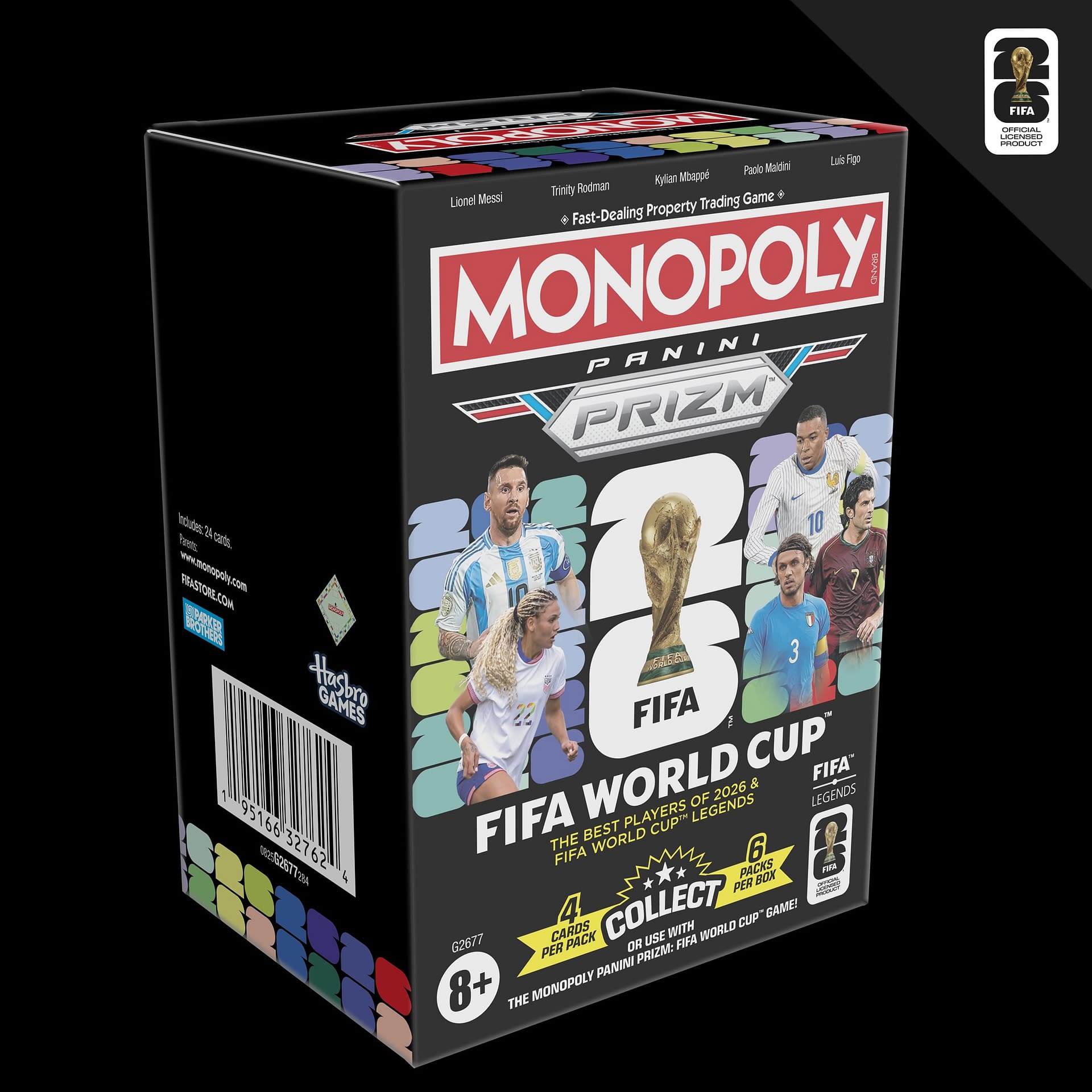 Collect, trade, and compete with the Monopoly Panini Prizm: FIFA World Cup Trading Cards booster box! It includes 24 Monopoly Panini Prizm FIFA cards, designed for collecting or playing with the Monopoly Panini Prizm: FIFA World Cup board game for teens, kids ages 8+, and adults. In each pack, look for randomly inserted Monopoly Panini Prizm parallels and ultra-rare cards! If using the Panini Prizm cards in the Monopoly Panini Prizm: FIFA World Cup board game, players can choose and trade FIFA players to build a world-class team. Compete against opponents by comparing Player Ratings and Stats on the backs of the cards. Monopoly Panini Prizm booster boxes and FIFA World Cup soccer card packs make fun stocking stuffers, Easter basket stuffers, white elephant gifts, and cool gifts for FIFA fans.