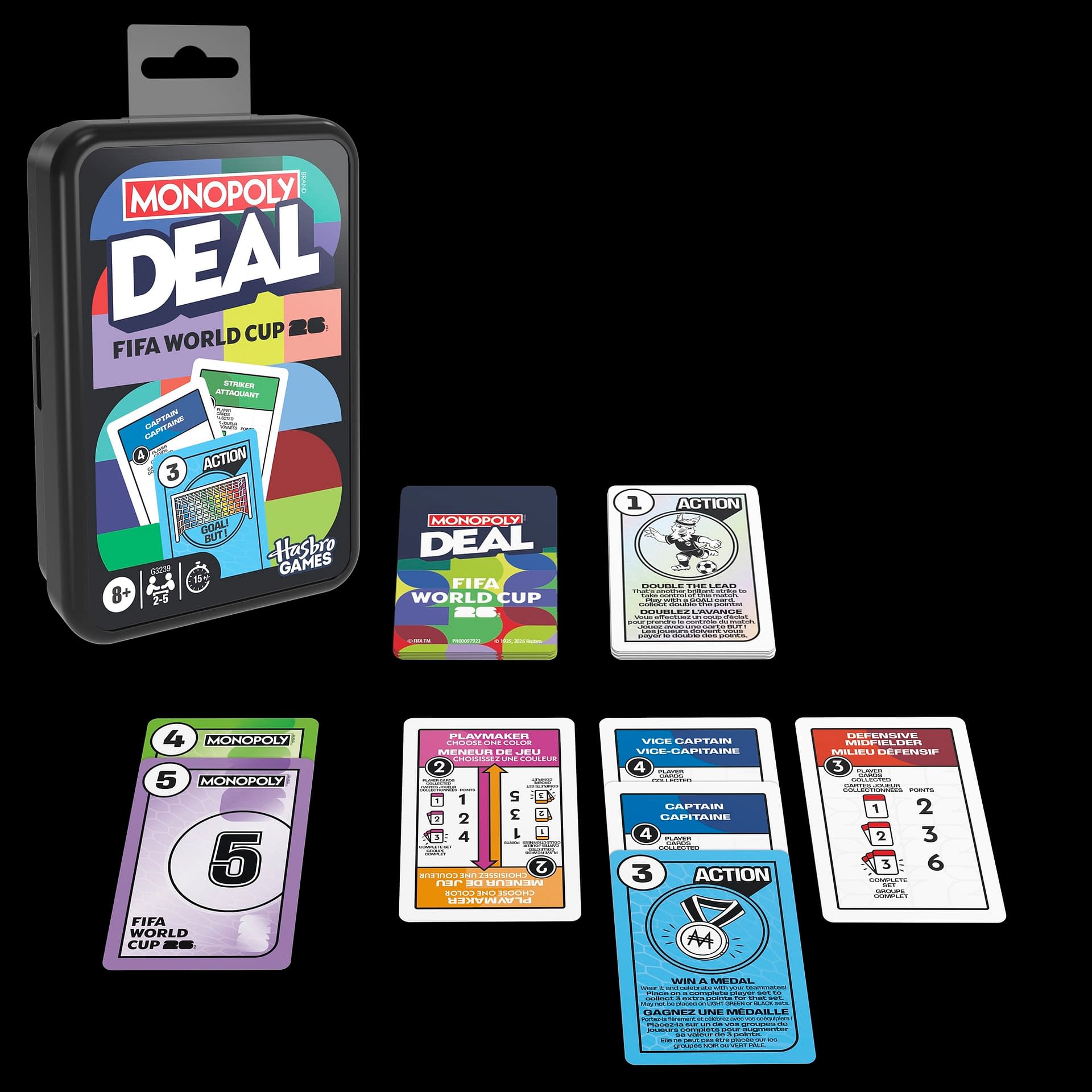 Build a winning soccer team in the Monopoly Deal FIFA World Cup 2026 Edition card game! It's a fast-paced game of unpredictable highs and lows, as players compete to be the first to collect 3 player sets, each in a different color, to win. But watch out! Opponents can gain an edge with Action cards that let them earn goals, double the lead, and more. For those searching for fun family card games or 2 player games, this Monopoly Deal game is an ideal choice! It's an exciting kid's card game for Family Game Night, FIFA World Cup 2026 parties, or after school. Looking for travel card games for kids and adults? This portable game is one of the best card games for camping, vacations, and tailgating.