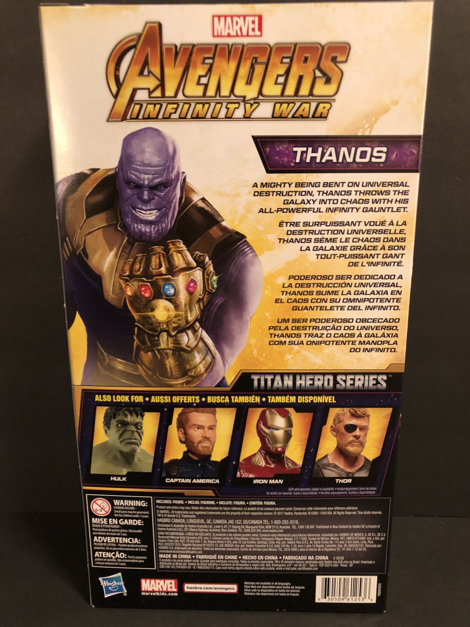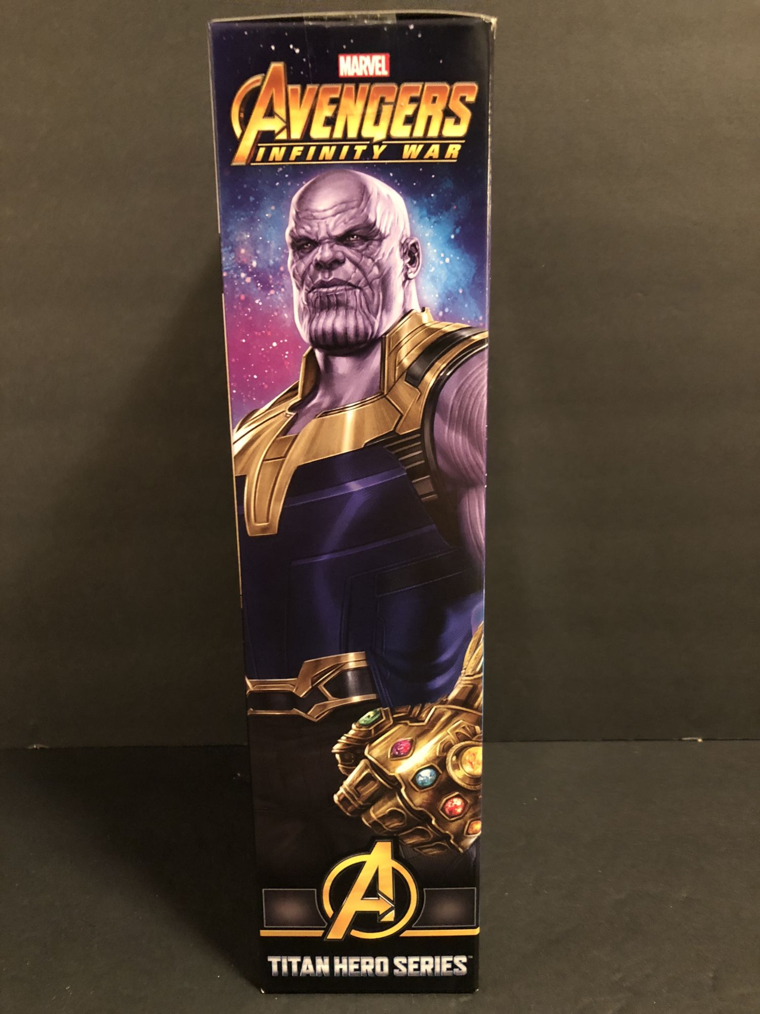 Just like Spidey, Thanos is housed in a box with the purple and gold color scheme, fitting for the character. I like the key art better on the back than the front; his grin on the front is really awkward-looking. The art on the side is probably the best overall; he looks the most menacing there.